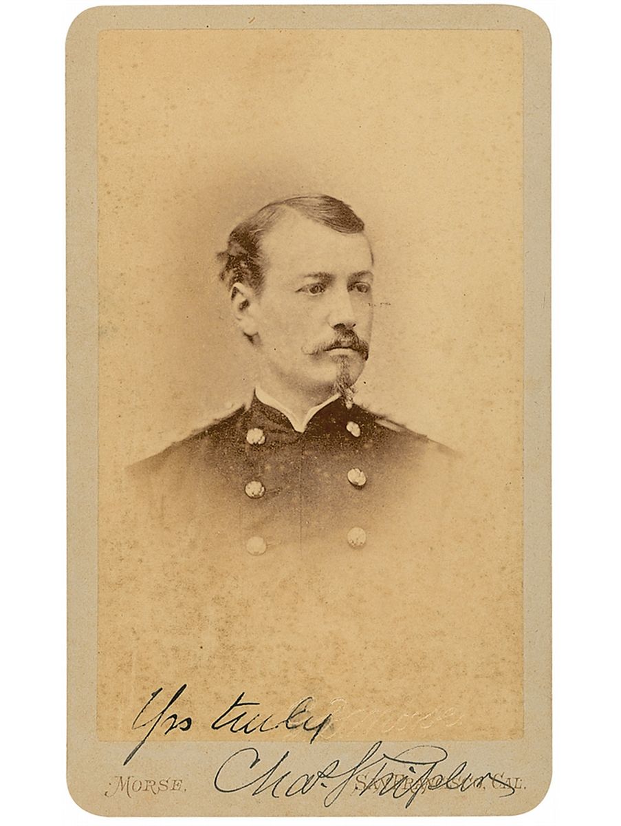 Union officer who served in the 96th and 12th New York Infantry. Original 2.25 x 4 carte-de-visite photo by Morse’s Palace of Art of San Francisco, signed in the lower border in black ink, “Yrs truly, Chas. S. Tripler.” In fine condition, with some light spotting to bottom portion of image and some light contrast to signature over printed photographer’s information.