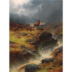 HAYMAKING AMONG THE MOUNTAINS; THE HOME OF THE RED DEER, Two oils on canvas; the former, signed and dated 1892 lower left, the latter, signed twice, bottom centre and lower right, each signed and titled to the stretcher