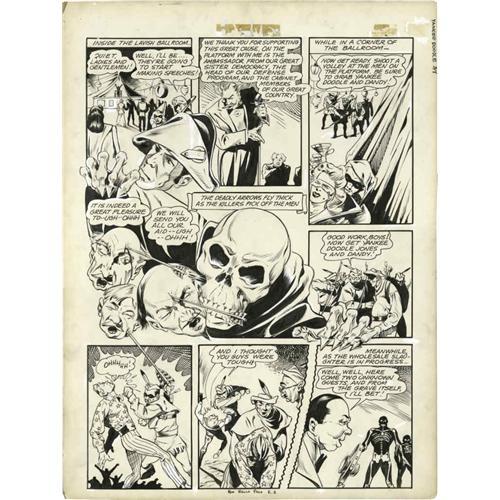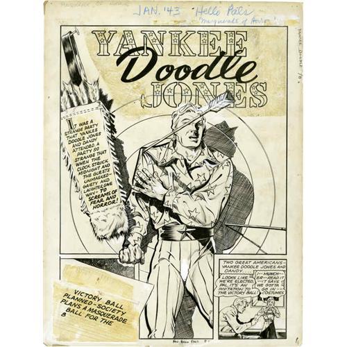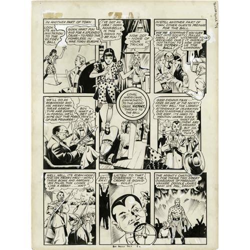 <B>Charles Sultan (attributed) - Hello Pal #3 Complete 8-page Yankee Doodle Jones Story "Masquerade of Horror" Original Art (Harvey, 1943).</B></I> Yankee Doodle Jones' origin was remarkably similar to that of Captain America. A patriotic, war veteran, Jones, gained a new super-human vitality from a scientist's serum. When the scientist was assassinated by enemies of America, his bereaved son also took an injection of the invincibility serum to transform himself into Jones' sidekick, Dandy. Nazi spies plan to attack a Victory Ball masquerade party dressed as Robin Hood and his merry men. Their arrows have been dipped in poison and only Yankee Doodle Jones and Dandy can smash their foul plot. The fine lined, graceful, and energetic artwork from the Harry "A" Chesler shop shows the unmistakable influence of Lou Fine's Golden Age artwork. The image area of each page measures 13" x 18", and aside from edge wear and missing type corrections on some of the pages, the art is in Very Good condition.