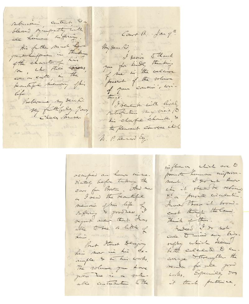 Charles Sumner (1811 – 1874). U.S. Senator, Congressional leader amongst the opponents of slavery. ALS. 4 pages. Court St. – Jan 9th. To M. P. Kennard, Esq. ; “I desire to thank you for kindly thinking of me in the welcome present of the volume of your cousin’s writings. I remember with lively satisfaction my visit to his cheerful chamber, & the pleasant converse which occupied an hour immediately before taking the cars from Boston. And now as I read the beautiful memoir of his life of suffering & goodness. I regret anew that I was able to see so little of him. But I trust to enjoy him now in his example & in his works. The volume you have given me is a valuable contribution to the influences, which are to promote human improvement. I do not know why it should be restrained to a ‘private circulation’. I would have it broadcast through the land. Think of this. Indeed I do not call to mind any biography which seems better calculated to encourage & strengthen the reader for all good works. Especially does it teach patience, submissive content & a blessed sympathy with all human sufferings. His father must have great happiness in thinking of the character of his son, who still lives, even on earth, in the beautiful memory of his life….Charles Sumner” A fine, lengthy letter. Folds. Fine.