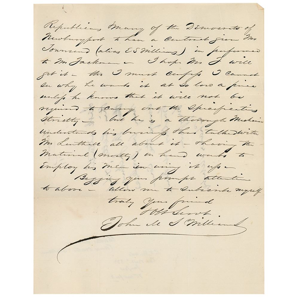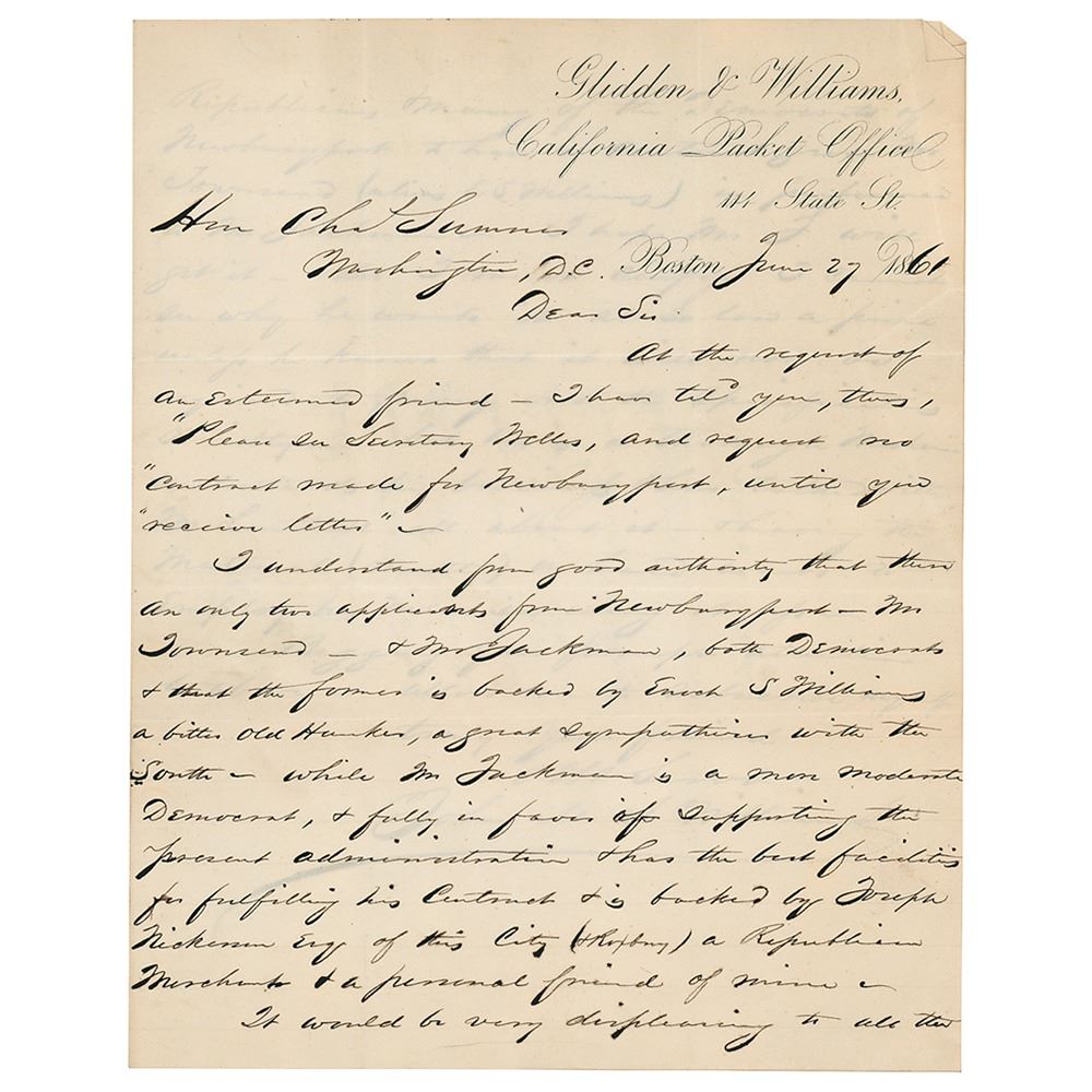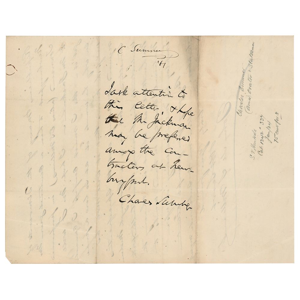 Civil War–dated autograph endorsement signed "Charles Sumner," on the reverse of a letter written to him by John M. S. Williams, two pages on two adjoining sheets, 7.75 x 9.75, June 27, 1861. Sumner writes: "I ask attention to this letter & hope that Mr. Jackman may be preferred among the contractors at Newburyport." In the letter, Williams asks Sumner to refer a matter to Secretary of the Navy Gideon Welles, offering information about applicants for a contract at Newburyport: "I understand from good authority that there are only two applicants from Newburyport—Mr. Townsend, & Mr. Jackman, both Democrats & that the former is backed by Enoch S. Williams, a bitter old hunker, s great sympathizer with the South—while Mr. Jackman is a more moderate Democrat, & fully in favor of supporting the present administration & has the best facilities for fulfilling the contract." In fine condition, with a rusty circular paperclip impression to the top and a few light creases.