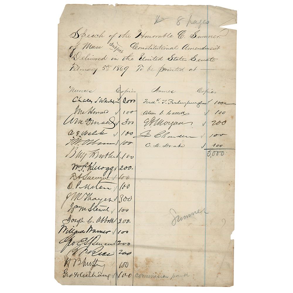 Significant manuscript DS, one page, 8 x 12.5, 1869. Order form document for the "Speech of the Honorable C. Sumner of Mass., subject Constitutional Amendment Delivered in the United States Senate, February 5th, 1869, to be printed," signed below by 22 members of the 40th United States Congress, all adding the number of copies desired. Signers are: Charles Sumner, Jacob M. Howard, Alexander McDonald, Adonijah Welch, Thomas W. Osborn, Benjamin F. Butler, William Pitt Kellogg, Frederick A. Sawyer, Oliver P. Morton, John M. Thayer, William M. Stewart, Joseph C. Abbott, Willard Warner, George E. Spencer, Benjamin F. Rice, Henry B. Anthony, George H. Williams, Frederick T. Frelinghuysen, Alexander G. Cattell, Edwin D. Morgan, Zachariah Chandler, and Charles D. Drake. In very good condition, with scattered soiling and some small tears and losses to the edges.