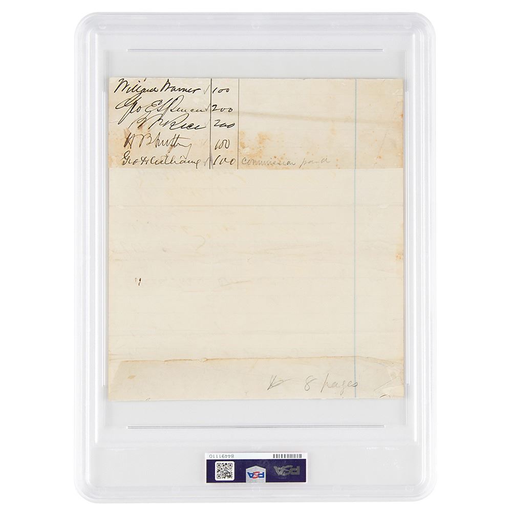 Significant manuscript DS, one page, 8 x 12.5, 1869. Order form document for the "Speech of the Honorable C. Sumner of Mass., subject Constitutional Amendment Delivered in the United States Senate, February 5th, 1869, to be printed," signed below by 22 members of the 40th United States Congress, all adding the number of copies desired. Signers are: Charles Sumner, Jacob M. Howard, Alexander McDonald, Adonijah Welch, Thomas W. Osborn, Benjamin F. Butler, William Pitt Kellogg, Frederick A. Sawyer, Oliver P. Morton, John M. Thayer, William M. Stewart, Joseph C. Abbott, Willard Warner, George E. Spencer, Benjamin F. Rice, Henry B. Anthony, George H. Williams, Frederick T. Frelinghuysen, Alexander G. Cattell, Edwin D. Morgan, Zachariah Chandler, and Charles D. Drake. In very good condition, with top and bottom edges folded, scattered soiling, and some small tears and losses to the edges. Encapsulated in a PSA/DNA authentication holder.