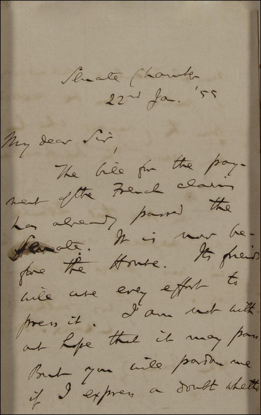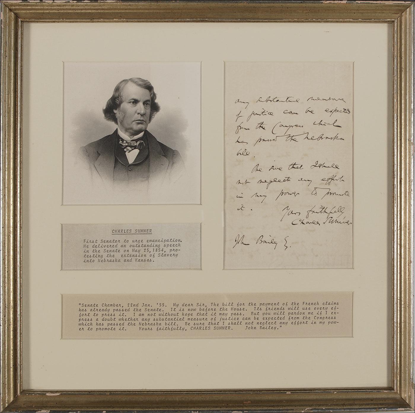 ALS, one page both sides, 4.5 x 7, January 22, 1855. Sumner writes to John Bailey. In full: “The bill for the payment of the French claims has already passed the Senate. It is now before the House. Its friends will use every effort to press it. I am not without hope that it may pass. But you will pardon me if I express a doubt whether any substantial measure of justice can be expected from the Congress which has passed the Nebraska bill. Be sure that I shall not neglect any effort in my power to promote it.” Matted and framed (so that both sides are visible), with a period engraving and two typed informational sheets to an overall size of 14.25 x 14.25. Faint show-through of writing and blot to one word, otherwise fine condition.