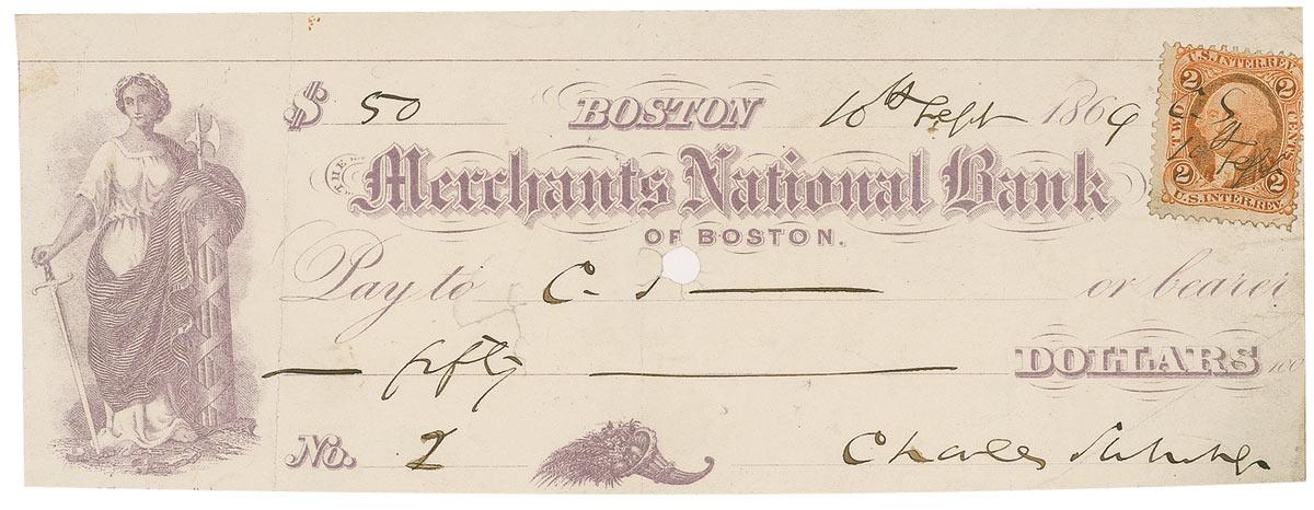 American politician (1811–1874) and Massachusetts senator best known as a radical Republican and a staunch opponent of slavery. In 1856, Sumner was severely beaten in the Senate chamber by South Carolina Congressman Preston Brook. Bank check, 7.5 x 3, filled out and signed by Sumner, payable to C. S. for $50, September 10, 1869. A revenue stamp, initialed by Sumner, is affixed at the top right corner. Two vertical folds, diagonal creases with one affecting his last name, wrinkling, irregular edges, and a small circular bank punch and cancellation cut in the center, otherwise fine condition.