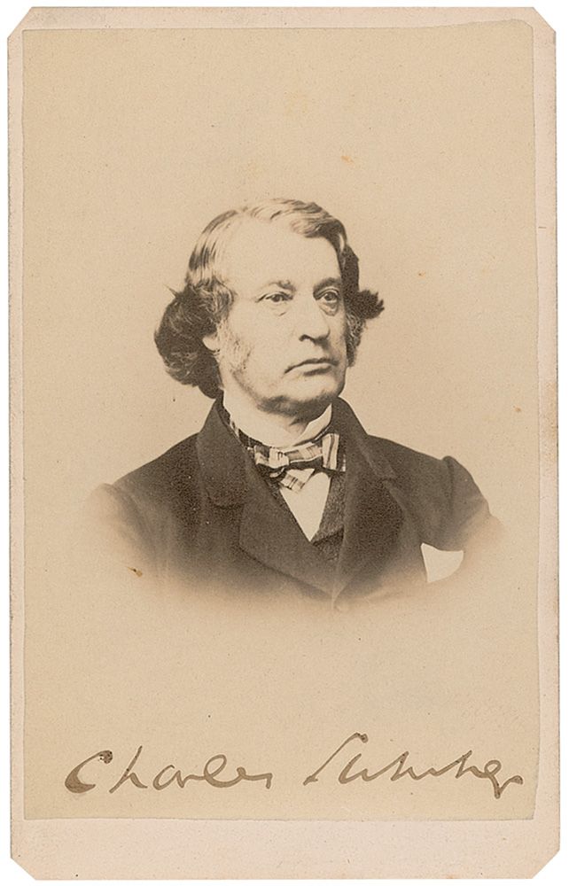 American politician (1811–1874) and Massachusetts senator best known as a radical Republican and a staunch opponent of slavery. Original 2.25 x 4 carte-de-visite photo of Sumner by the Whitehurst Gallery of Washington, D. C., signed along the bottom of the image in black ink. In fine condition.