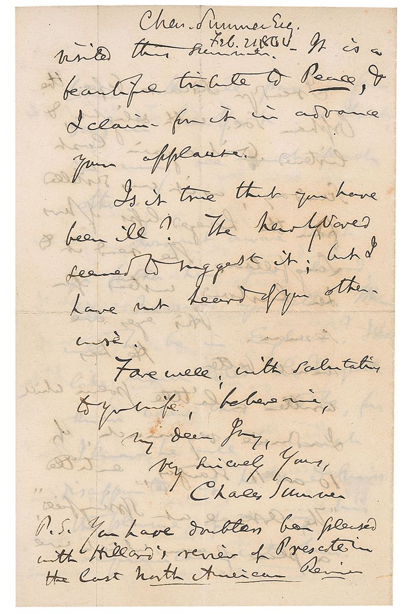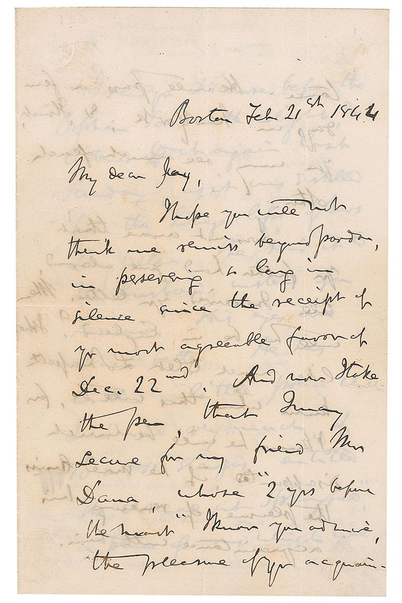 ALS, two pages both sides, 9.25 x 7.25, February 21, 1844. Sumner references several authors, including Dana and Longfellow, in this letter likely sent to John Jay, Jr., an attorney, diplomat, and grandson of Supreme Court Justice John Jay. In part: “And now I take the pen, that I may secure for my friend Mr. Dana, whose ‘2 years before the mast’ I know you admire, the pleasure of your acquaintance. He will pass a few days in New York; & I think, you may see much of each other…I read your discourse before the Orphan Soc. with delight, & listened to it again last Sunday, as it was distilled from the honeyed lips of Mrs. Longfellow. She read it to her husband instead of a sermon. His eyes are much better. He has written a little poem which I admire very much, of 10 or 11 stanzas, entitled ‘The Arsenal at Springfield,’ a place of arms which we visited this summer.” In fine condition, with unobtrusive intersecting folds and show-through from writing to opposing sides.