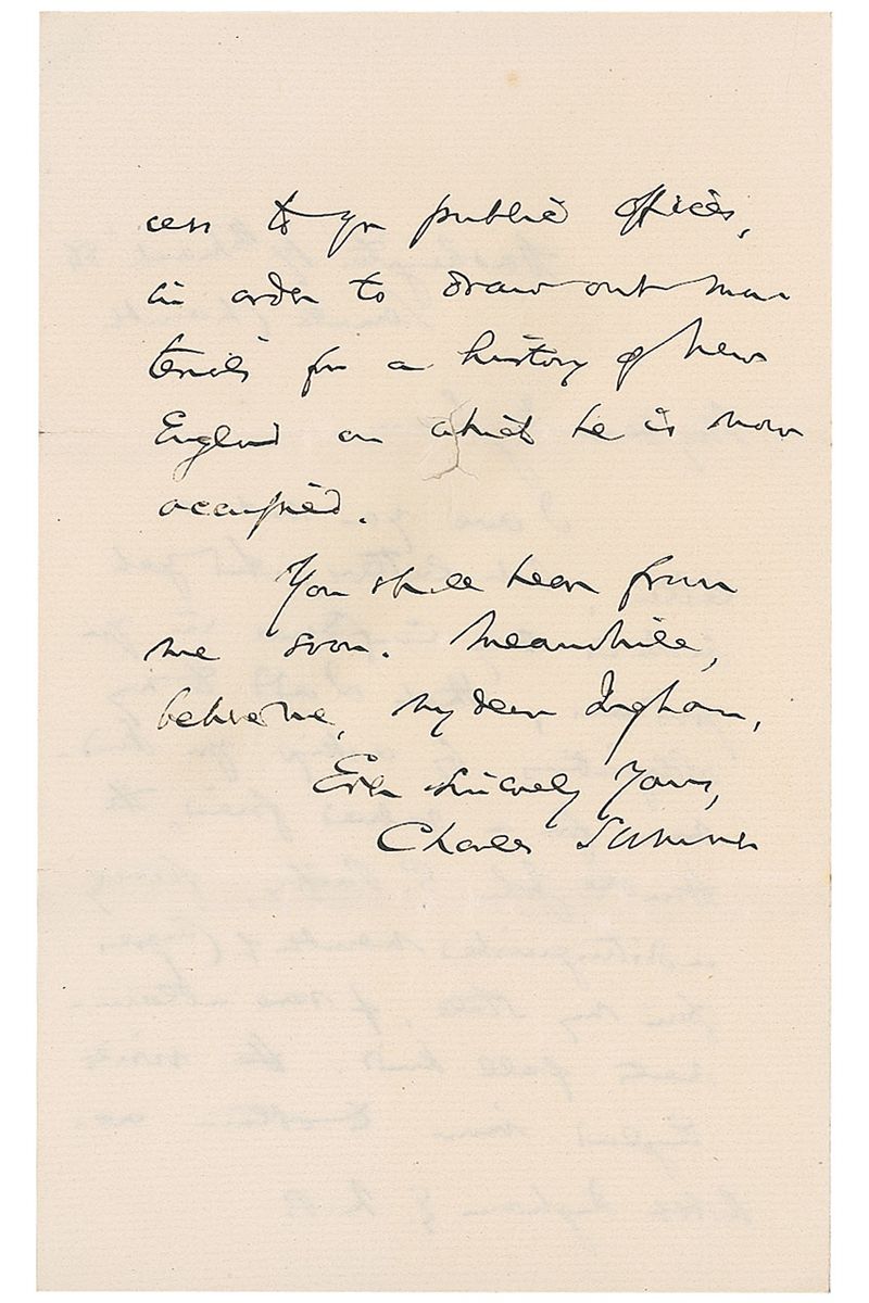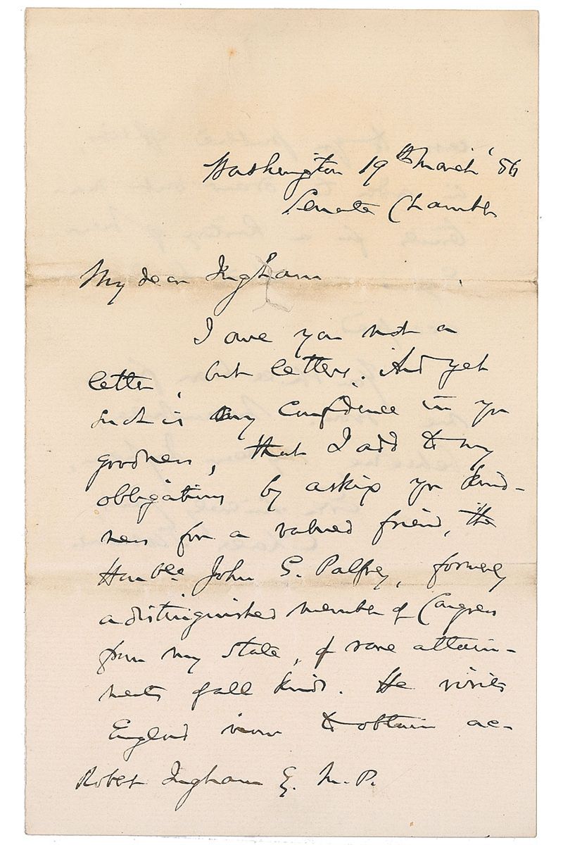 ALS, one page both sides, 5 x 8, Washington, March 19, 1856. Letter of introduction to Robert Ingham, a member of the British parliament. In part: “John G. Palfrey, formerly a distinguished member of Congress from my state…visits England now to obtain access to your public offices, in order to draw out materials for a history of New England on which he is now occupied.” A puncture to the top portion of the letter, affecting the opening and one word on the reverse, otherwise fine condition. The first volume of Palfrey’s work, entitled History of New England to the Revolutionary War, was published in 1859, and continued on to a total of five volumes.