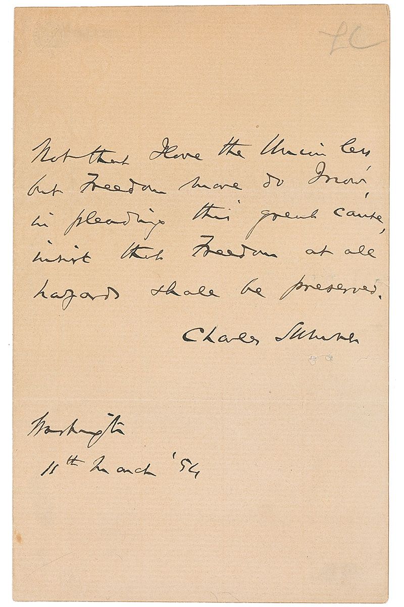 AQS on an off-white 4.75 x 7.5 sheet. Sumner pens a quote from his speech, The Landmark of Freedom. In full: “Not that I love the Union less, but freedom more, do I now, in pleading this great cause, insist that freedom, at all hazards, shall be preserved.” Signed at the conclusion, “Charles Sumner, Washington, 11th March ’54.” In fine condition, with some scattered light creases and toning.