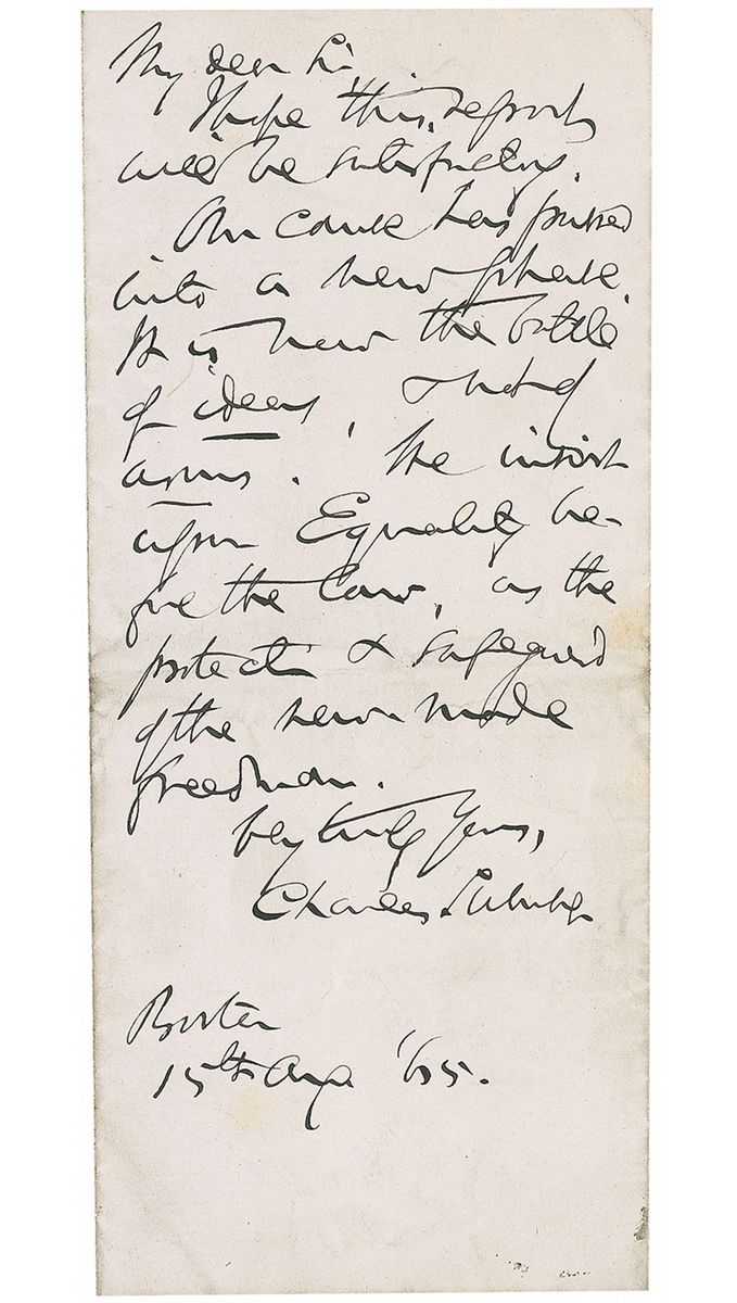 American politician (1811–1874) and Massachusetts senator best known as a radical Republican and a staunch opponent of slavery. In 1856, Sumner was severely beaten in the Senate chamber by South Carolina Congressman Preston Brook. ALS, one page, 9.5 x 7.75, April 15, 1865. Letter to an unidentified gentleman, written in the center panel of the sheet. A strong statement by the great abolitionist on Equality, issued on the day following Lincoln’s assassination. In full: “I hope this report will be satisfactory. Our cause has passed into a new phase. It is now the battle of ideas & not of arms. We insist upon Equality before the law, as the protection & safeguard of the new made freedom.” Sheet is affixed by the reverse of its left edge to a slightly larger light brown sheet. Scattered toning and soiling and vertical folds to either sides of text, otherwise fine condition.