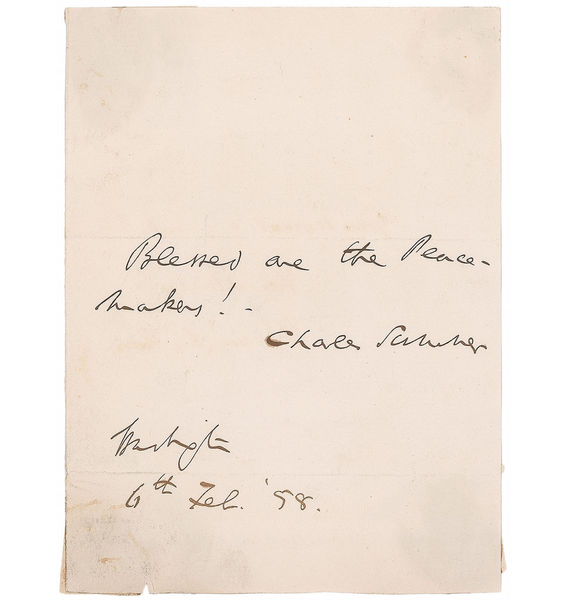 American politician (1811–1874) and Massachusetts senator best known as a radical Republican and a staunch opponent of slavery. In 1856, Sumner was severely beaten in the Senate chamber by South Carolina Congressman Preston Brooks. Bold AQS on an off-white 5 x 6.5 sheet, signed at the conclusion, “Charles Sumner, Washington, 6th Feb. ’58.” Sumner pens a biblical verse from Matthew 5:9, in full: “Blessed are the peacemakers.” Two horizontal folds, light soiling, and a bit of show-through at corners from mounting remnants to reverse, otherwise fine condition.