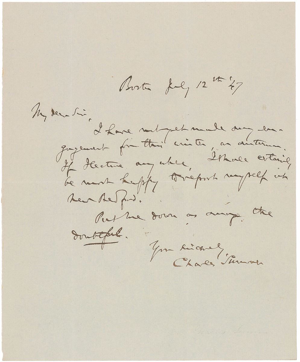 ALS, one page, 7.25 x 8.75, July 12, 1847. In part: “I haven’t yet made any engagement for this winter…If I lecture anywhere, I shall certainly be most happy to report myself in New Bedford. Put me down as…doubtful.” In fine condition, with intersecting folds (one vertical fold passing through a single letter of the first name) and some unobtrusive mounting remnants to reverse.