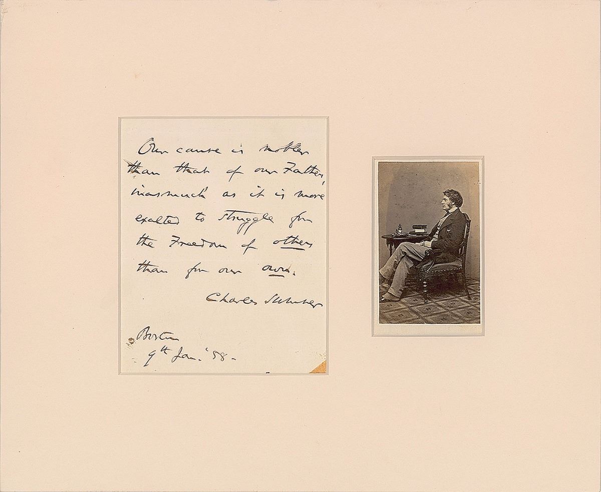 AQS, one page, 4.25 x 5.25, January 9, 1858. A fantastic quote from the outspoken abolitionist, in full: “Our cause is nobler than that of our Fathers, inasmuch as it is more exalted to struggle for the Freedom of others than for our own.” Nicely matted with an original carte-de-visite portrait of Sumner. In fine condition, with a small tape stain to the lower right corner.