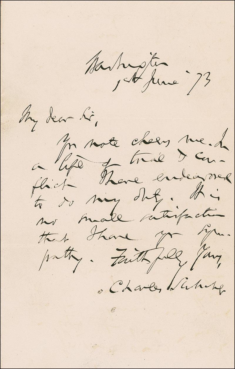American politician (1811–1874) best known as a radical Republican and a staunch opponent of slavery. On May 22, 1856, Sumner was famously assaulted and severely beaten in the Senate chamber by South Carolina congressman Preston Brook. Sumner’s injuries were so severe that he was unable to attend sessions of Congress for the next three years. ALS, one page, 5 x 8, June 1, 1873. Letter to S. B. Hunt. In full: “Your note cheers me. In a life of trial & conflict I have endeared to do my duty. It is no small satisfaction that I have your sympathy.” In fine condition, with some scattered light soiling and toning. Accompanied by the original free-franked mailing envelope, addressed in Sumner’s hand and franked in the upper right, “C. Sumner.” RRAuction COA.