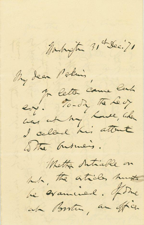 “…I AM SORRY THAT OUR MUSEUM CANNOT SECURE THE JARVIS COLLECT[ION], AS AN ILLUSTRATION OF ART IN EARLY DAYS…” CHARLES SUMNER (1811-1874). American statesman, abolitionist and Senator from Massachusetts. Autograph Letter Signed, “Charles Sumner,” as Senator. Four page, 5” x 8”. Washington. Dcember 31, 1871. Sumner writes, in part: “…Today the Sec’y was at my house, when I called his attention to the business. Whether dutiable or no, the articles must be examined. If done at Boston, an officer from the N.Y. Custom H[ouse] must accompany them being paid by the importer. For this, there must be authenticity…which he will give. On the Free list of Tariff are ‘Collections of Antiques especially imported & not for sale’, also ‘Paintings, statuary, fountains & other works of art expressly for presentation at Nat. institutions or to any State or to any municipal corporation.’ I think your articles must come under one of these heads. …I am sorry that our museum cannot secure the Jarvis Collect., as an illustration of art in early days. I would be a good beginning. I wish you a happy New Year! Charles Sumner.” Fine.