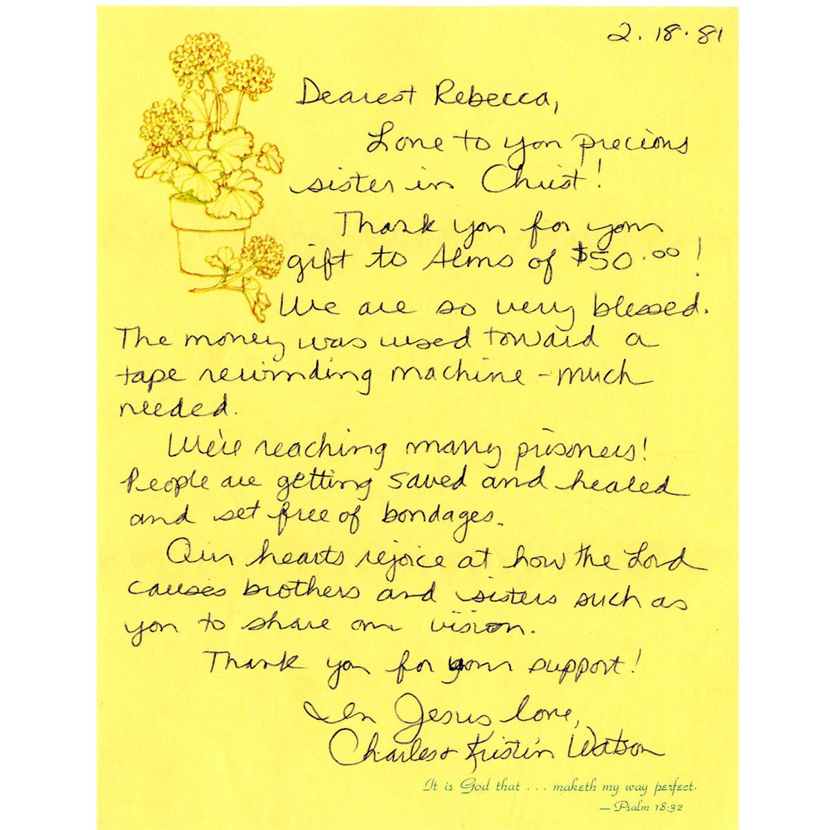 Infamous ''Manson Family'' member Charles ''Tex'' Watson autograph letter signed, dated 18 February 1981, from Mule Creek State Prison, on a Christian-themed greeting card. Here, Watson sends thanks for a donation of $50 to ''Abounding Love Ministries,'' his Christian outreach organization he founded in the late 1970's from prison: ''…We are so very blessed. The money was used toward a tape rewinding machine -- much needed…We're reaching many prisoners! People are getting saved and healed and set free…'' Letter on one page measures ADD> near fine.