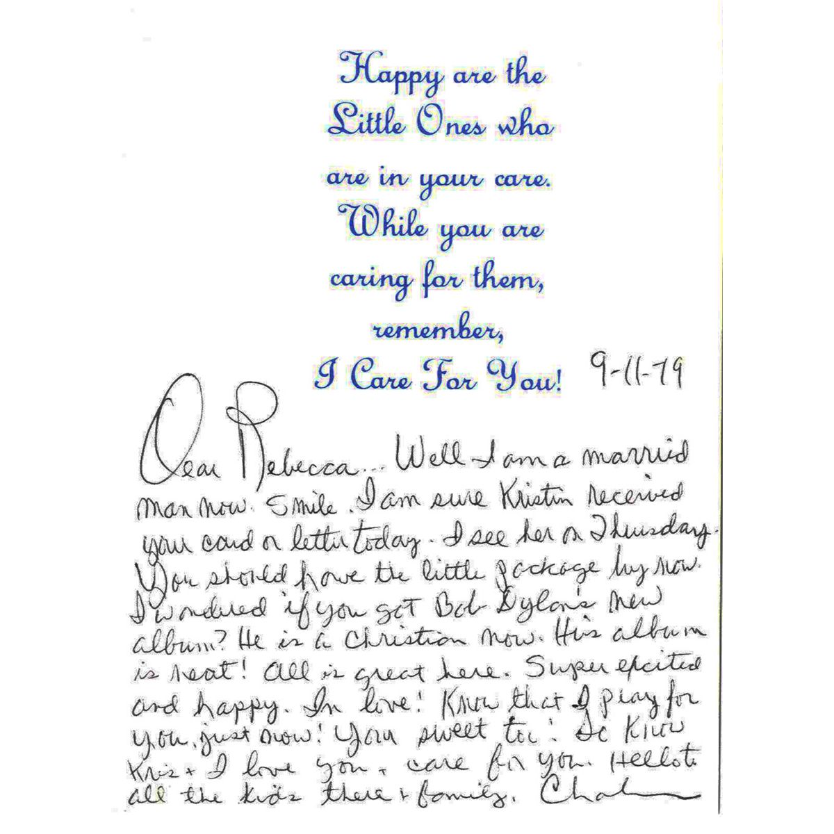 Infamous ''Manson Family'' member Charles ''Tex'' Watson autograph letter signed, dated 11 September 1979, from Mule Creek State Prison, on a Christian-themed greeting card. Letter reads in part: ''Dear Rebecca...Well I am a married man now. Smile...I wondered if you got Bob Dylan's new album? He is a Christian now. His album is neat! All is great here. Super excited and happy. In love! Know that I pray for you, just now! You sweet too...'' Signed ''Charles''. Greeting card, measuring 4'' x 6'', is in near fine condition.