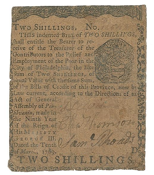 Colonial Pennsylvania engraved bank note for "Two Shillings," signed "Cha. Thomson," 2.75 x 3.25, reading: "This indented Bill of Two Shillings, shall entitle the Bearer to receive of the Treasurer of the Contributors to the Relief and the Employment of the Poor in the City of Philadelphia, the like Sum of Two Shillings, of equal Value with the same Sum of the Bills of Credit of this Province, now by Law current, according to the Directions of an Act of General Assembly of Pennsylvania, made in the Ninth Year of the Reign of His Majesty George III, Dated the Tenth of March, 1769." Signed at the conclusion by Jacob Lewis, Charles Thomson, and Samuel Rhoads, Jr. In very good condition, with intersecting folds, overall wear, and a small inventory label affixed to the reverse.