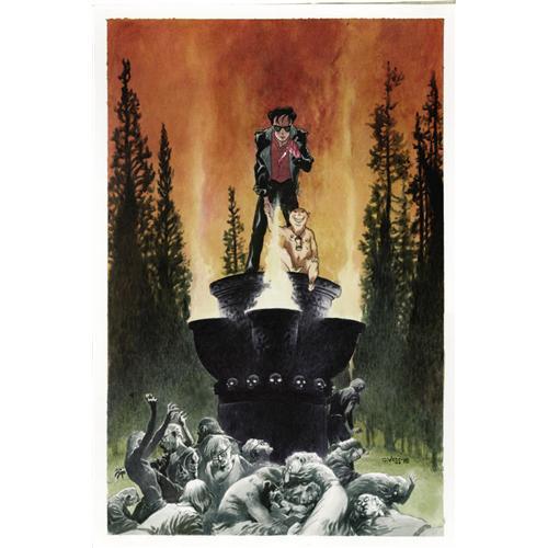 <B>Charles Vess - The Books of Magic Annual #3 Cover Original Art (Vertigo, 1999).</B></I> From "The Thousand Deaths of Timothy Hunter," written by Neil Gaiman, comes this smoldering image of Hunter, set on a flaming pedestal, surrounded by a mass of spectacled acolytes. This startling illustration by Charles Vess, has an image area of 10.5" x 18". Painted in washes of watercolor and pen and ink, this incredible piece is in Excellent condition, and signed by Charles Vess.