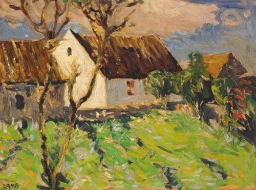 <B>Charles Vincent Lamb RHA RUA (1893-1964)</B><BR>THATCHED COTTAGES WITH TREES AND FIELD<BR>signed lower left<BR>oil on panel<BR>26 by 36cm., 10.25 by 14in.<BR><BR>