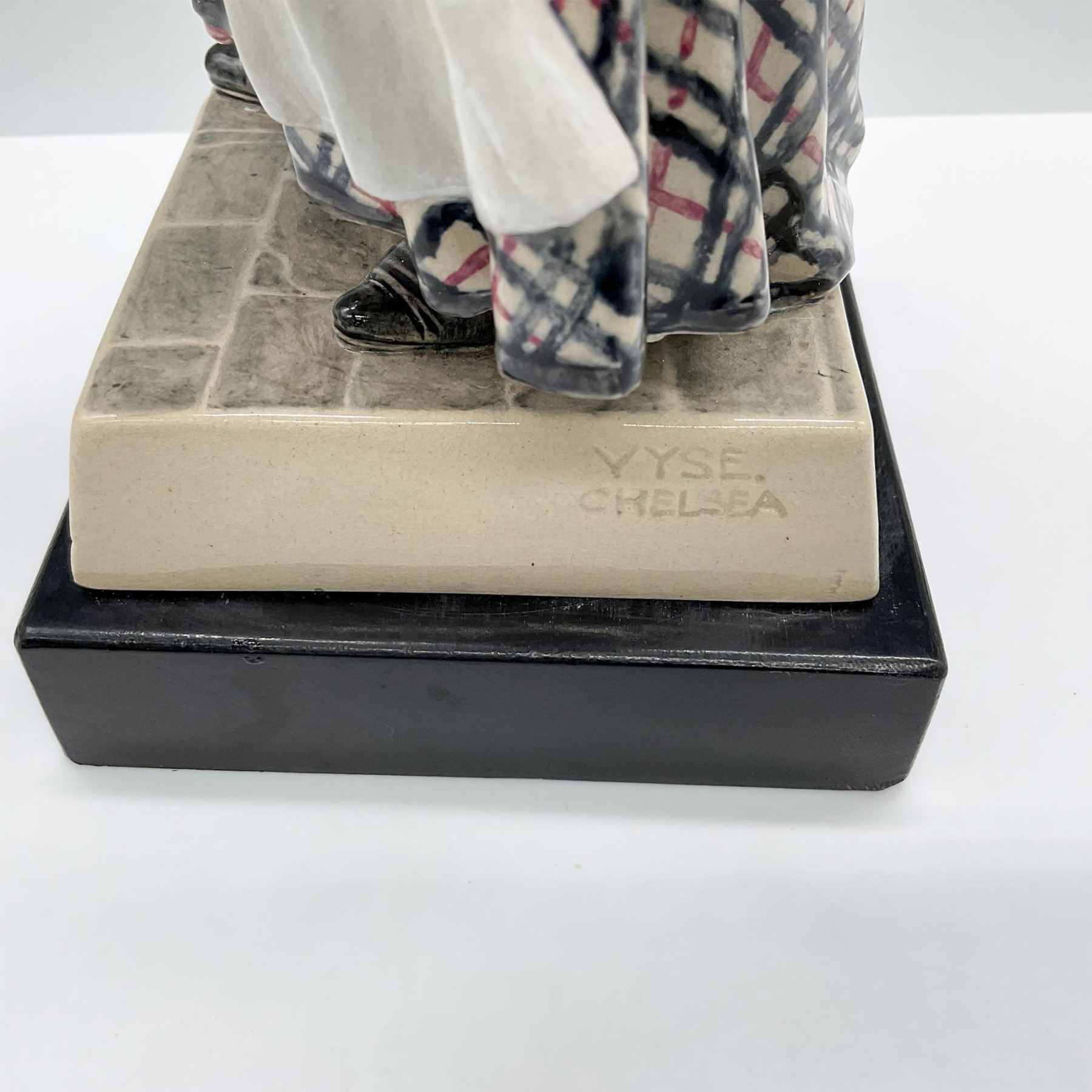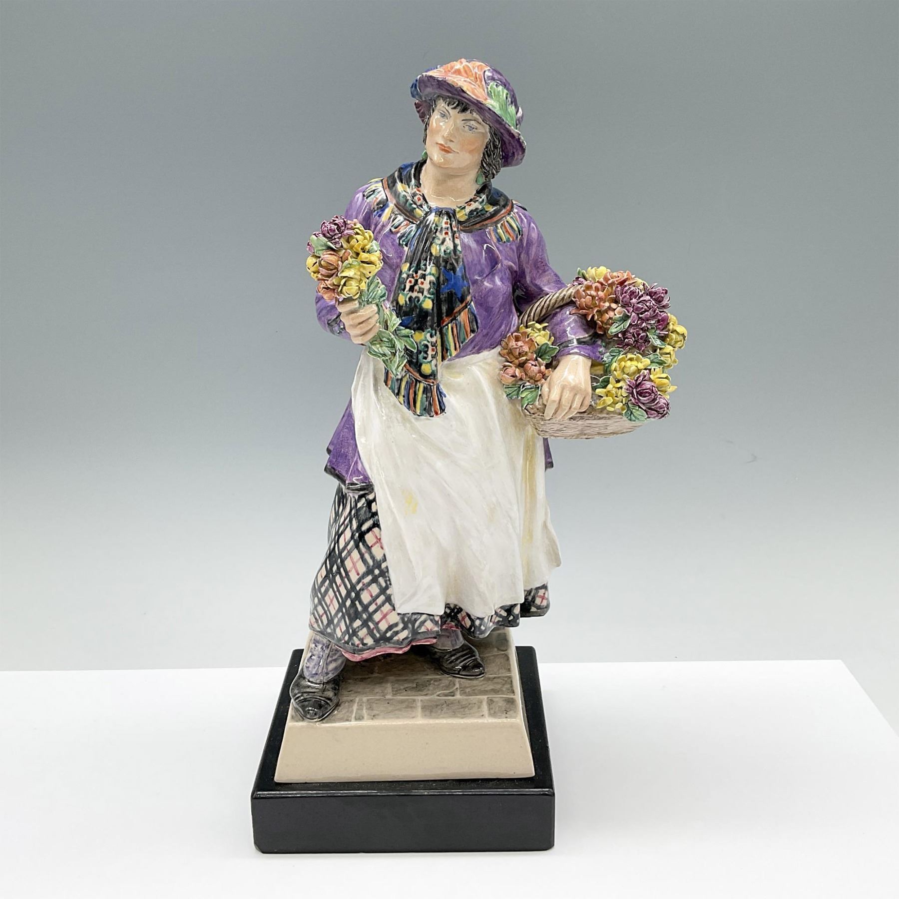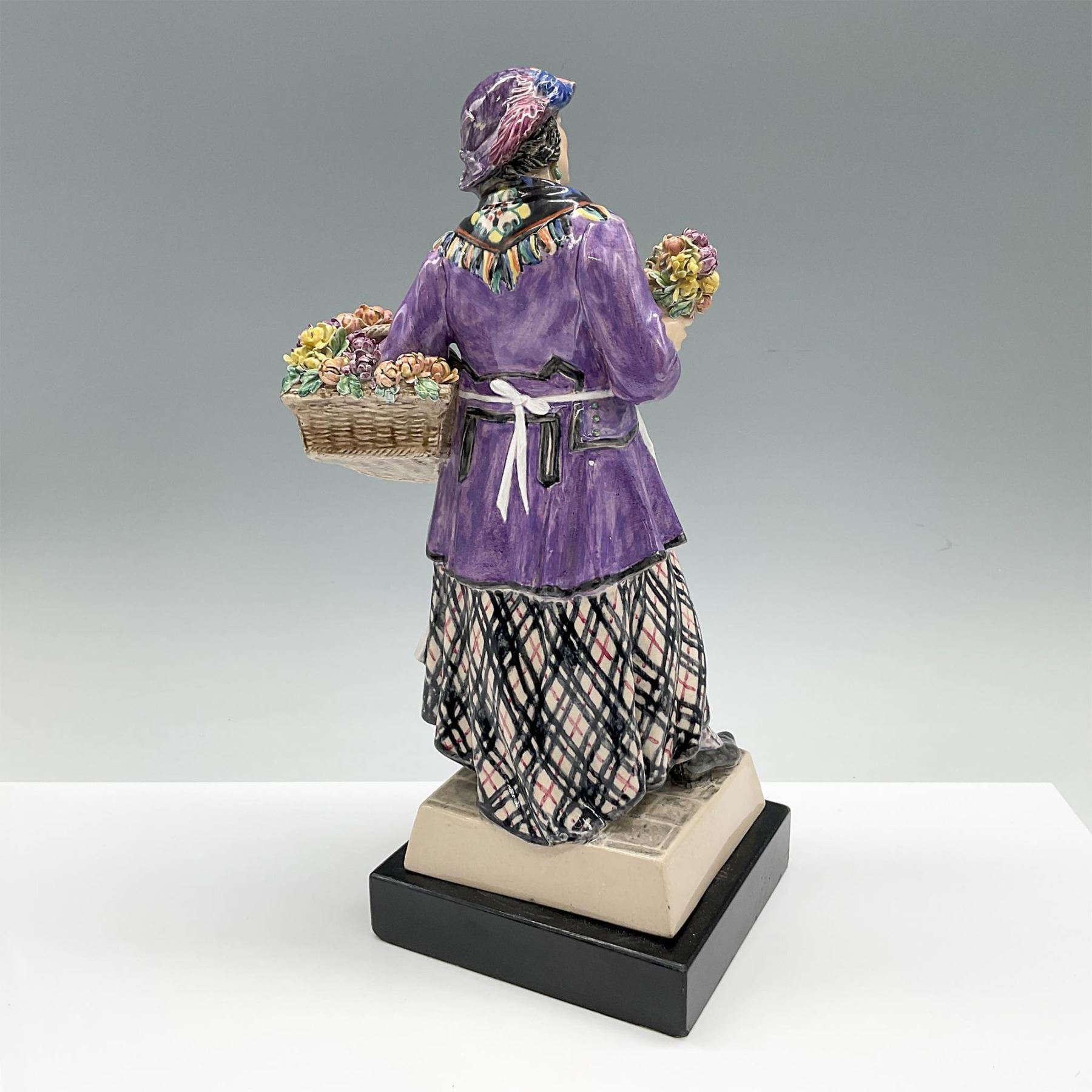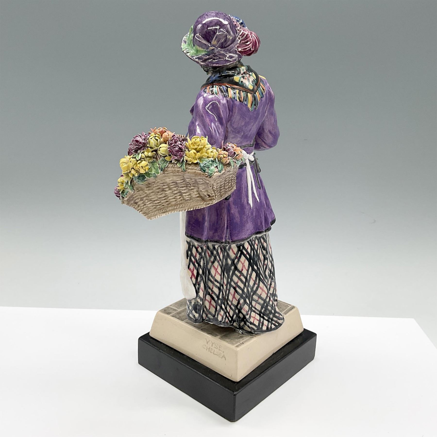 Rare variation of an English pottery figure of a flower vendor with a bouquet and basket of mums. The skirt is in black and pink plaid pattern. The scarf is black with colored tassels and flowers. Incised mark on the side: Vyse, Chelsea.