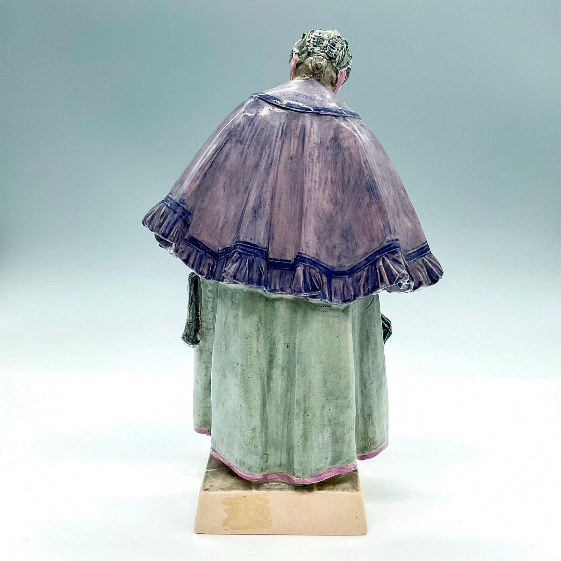 Glazed earthenware modeled as an elderly lady wearing a purple and blue jacket, holding a green umbrella. Marked Charles Vyse Chelsea 1925 to bottom.