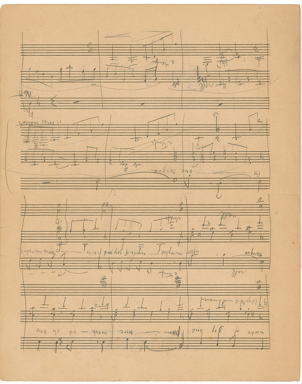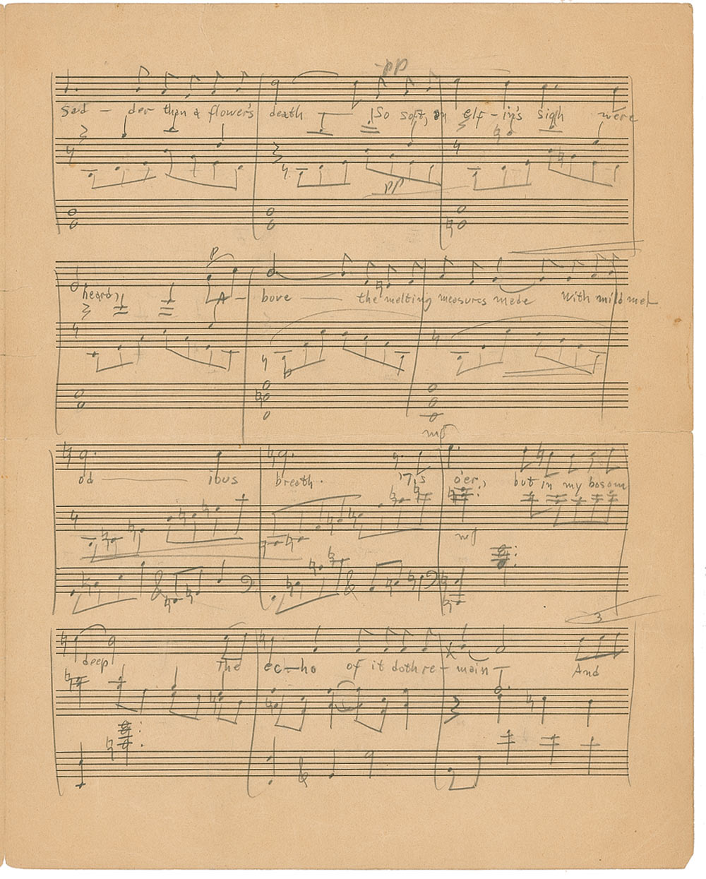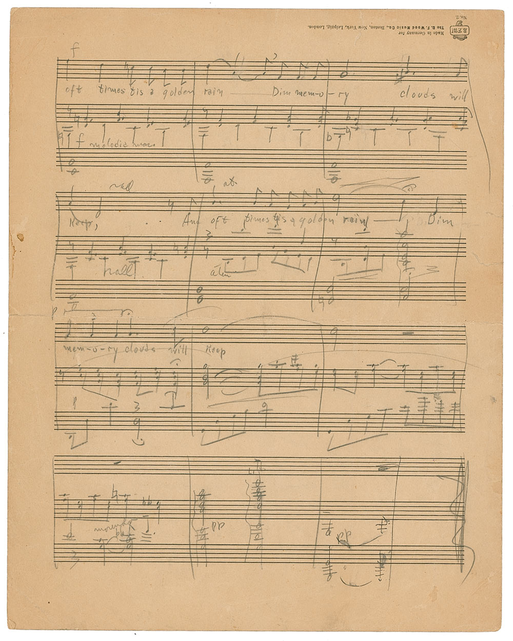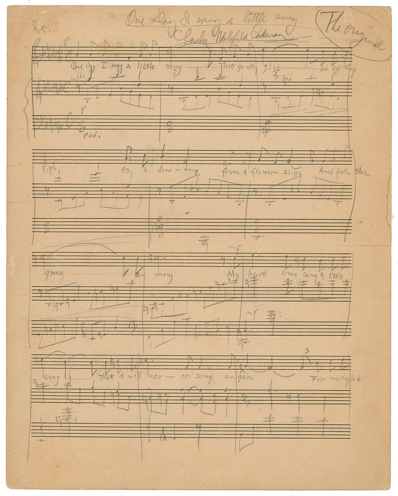 Composer (1881-1946) of operas on Indian themes, choral works, and hundreds of songs. Handwritten and signed musical manuscript, in pencil, four pages on two adjoining 10.5 x 13.25 sheets of musically-lined paper. Headed at the top “One Day I Sang a Little Song, Charles Wakefield Cadman,” adding “The Original,” in the upper right. Cadman pens 48 bars of music and lyrics to the song. In good to very good condition, with partial separation along ventral horizontal fold, scattered toning, soiling, and damp staining, and mild overall creasing and wrinkling. A rare and lengthy look at a work in progress.