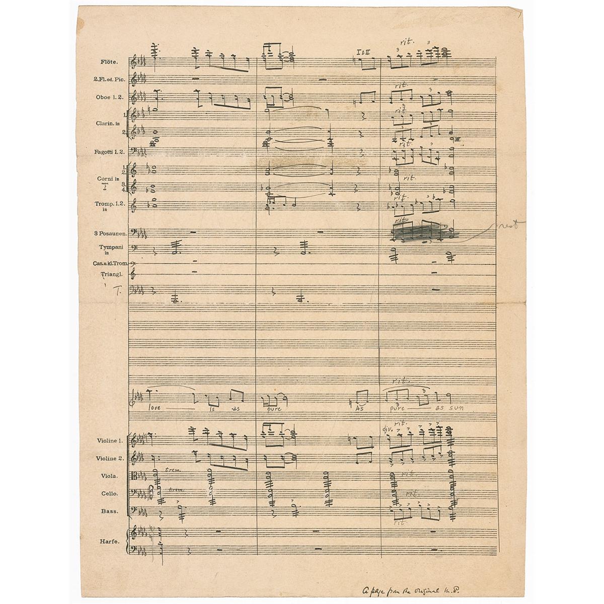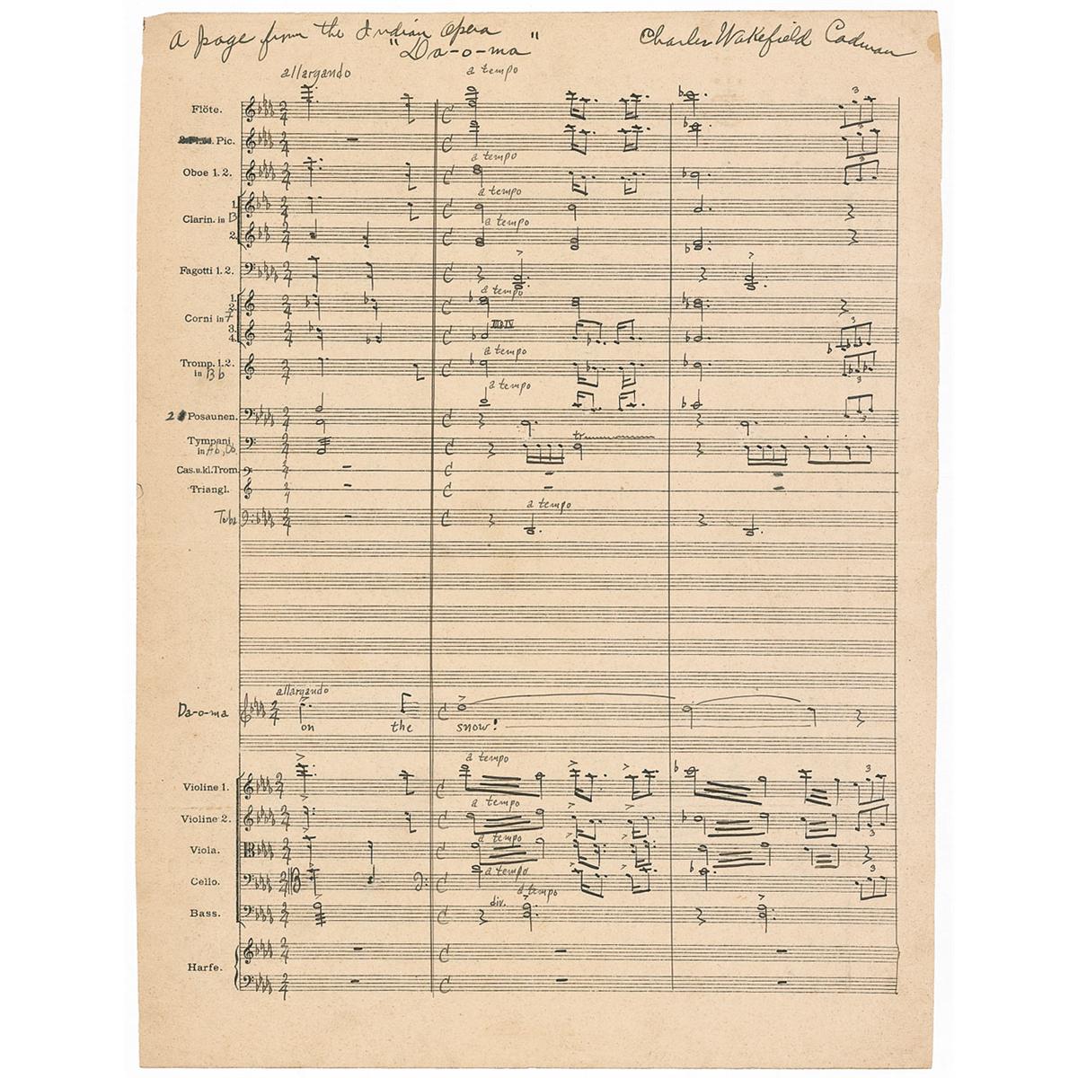 Composer (1881-1946) of operas on Indian themes, choral works, and hundreds of songs. Vintage signed handwritten musical manuscript, one page of musically lined paper, both sides, 10.25 x 13.5. Cadman pens a total of 98 bars of music and notations for multiple instruments, to his opera ‘Da-o-ma,’ including flute, clarinet, drums, percussion, violin, cello, and bass. Signed at the top, “A page from the Indian opera ‘Da-o-ma’ Charles Wakefield Cadman.” In very good to fine condition, with a central horizontal fold, a uniform shade of toning, and scattered light soiling.