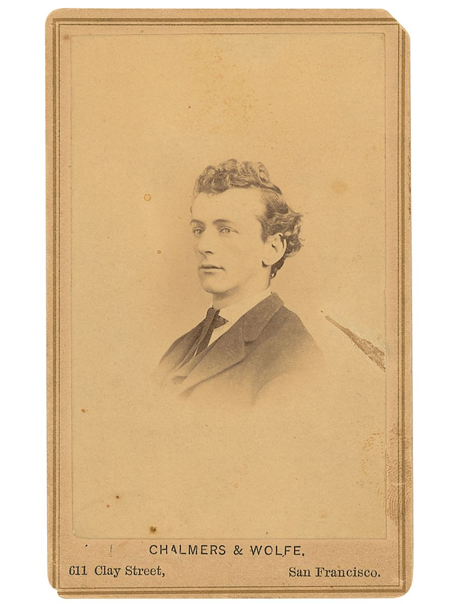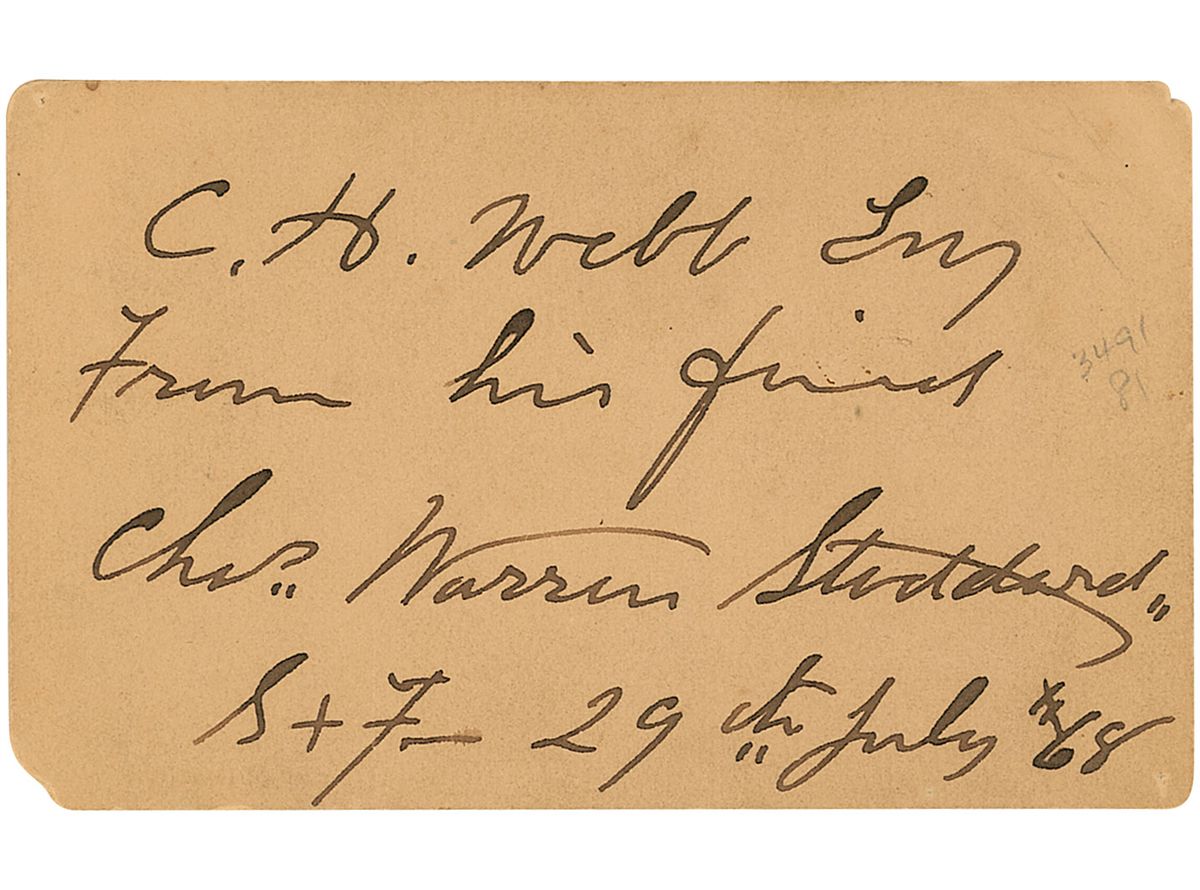 American author (1843–1909) who published under the name Pip Pepperpod. Original 2.25 x 4 carte-de-visite photo by Chalmers and Wolfe of San Francisco, signed and inscribed on the reverse in black ink, “C. H. Webb Esq. from his friend, Chas. Warren Stoddard, S&F 29th July ‘68.” In very good condition, with missing two corner tips, scattered light toning and soiling to image side, and uniform toning and pencil notation to reverse. Webb is probably Charles Henry Webb, an American journalist who wrote under the pseudonym John Pal. Webb also published Samuel Clemens’s first book.