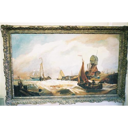 Great old original oil by well listed British artist Charles Webb (1830-1895); a similar sized painting of his has sold for $40,000.00 at auction and the period frame which accompanies this huge, active harborscape is one of the nicest I've ever seen! Oil is signed L/L "Charles Webb" and is additionally identified on the nameplate lower frame moulding center. Reverse of canvas has some significant but professionally done restoration, but overall condition is good and this piece is a great, dignified, and masculine work which would look terrific over a fireplace mantle or in a library or study. The terracotta/peach aspect of the sky actually changes hue in the differing light of day and the foreground aspect of the painting is actually a study of depth of field...a great work by a masterful painter. Thanks for your interest, Chas.