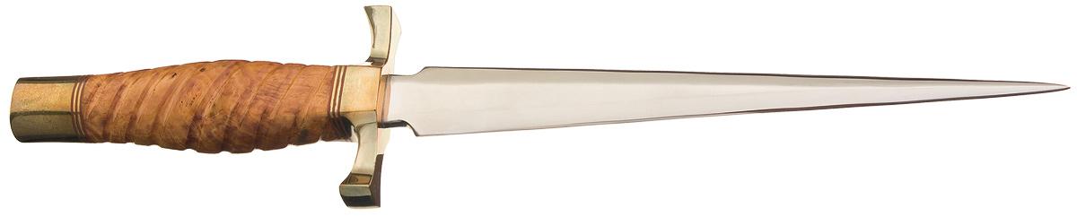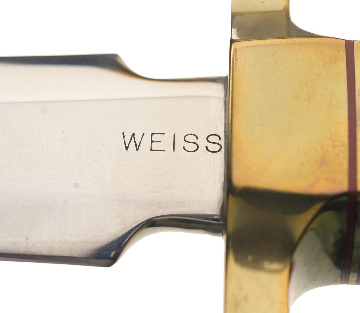 This dagger was fabricated by Master Knifemaker Charles Weiss of Phoenix, Arizona. The dagger has an 8 3/4 inch blade marked "WEISS". The guard and pommel are brass and are adorned with three red bands. The attractive fancy burled walnut handle is fluted. OAL: 13 3/4".