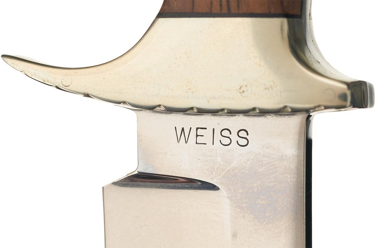 This knife was fabricated by Master Knifemaker Charles Weiss of Phoenix, Arizona. The knife has a 7 inch blade marked "WEISS". File work on the silver finger guard, with hardwood scales secured to the tang with four rivets. OAL: 11 3/4".