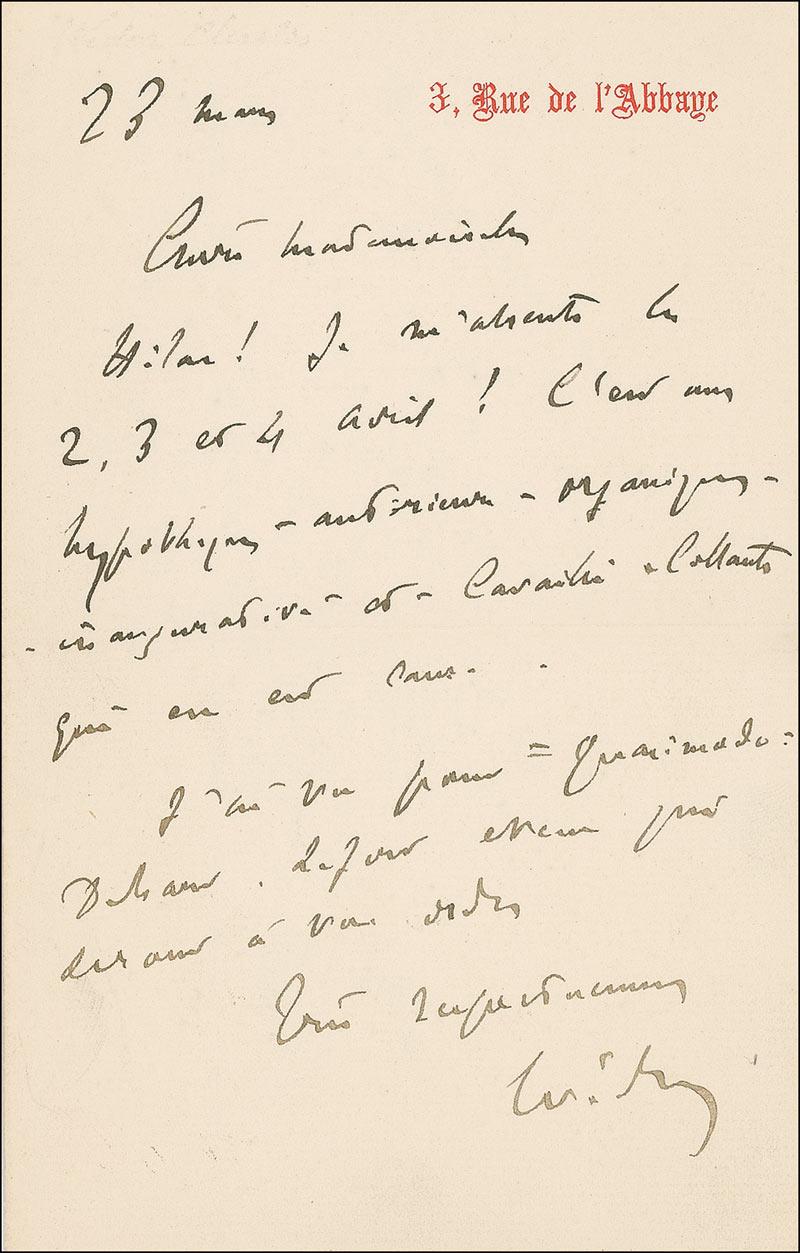 French organist, composer, and teacher (1844–1937). ALS in French, signed “Widor,” one page, 4.5 x 7, Rue de l’Abbaye letterhead, May 23. An untranslated letter to an unidentified recipient. In fine condition.
