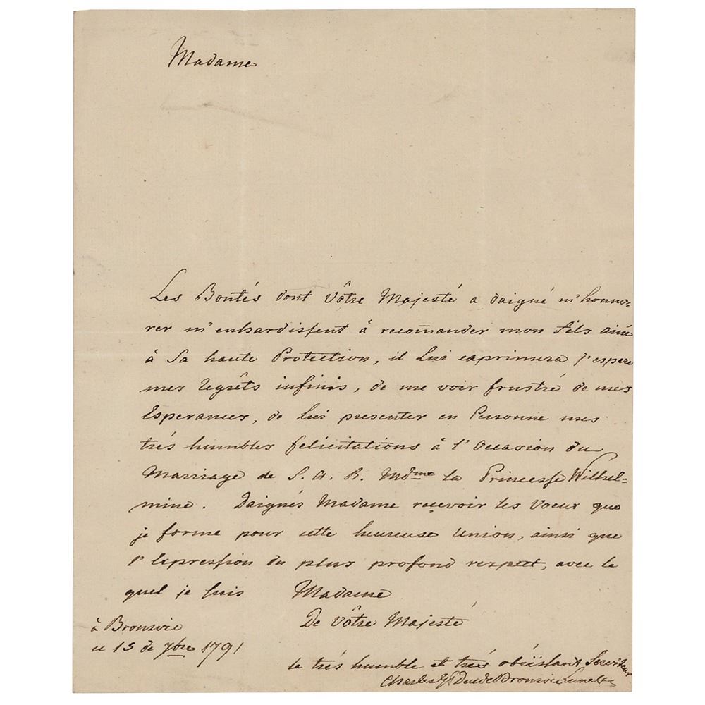 Celebrated military leader (1735–1806) and prince of Brunswick-Wolfenbüttel, recognized as a cultured and benevolent despot and a master of 18th century warfare. He was mortally wounded by a musket ball at the Battle of Jena–Auerstedt during the Napoleonic Wars. ALS in French, one page, 7.25 x 9, September 15, 1791. Untranslated handwritten letter in French, extending congratulations on the marriage of Wilhelmine of Prussia to William I of the Netherlands. In fine condition.