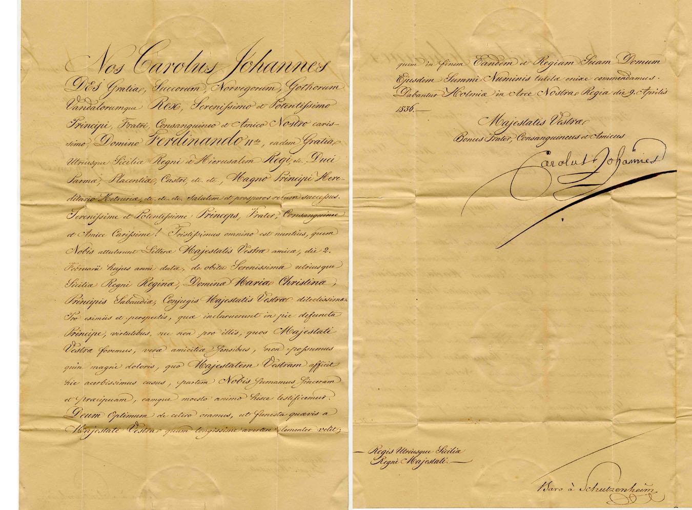 Scarce Charles XIV John of Sweden document in Latin, signed ''Carolus Johannes'' as King of Sweden and Norway, and dated 9 April 1836 in Stockholm. Addressed to Ferdinand II, King of the Two Sicilies, Charles XIV John extends his condolences on the untimely death of Ferdinand's Queen Consort, Maria Christina. Also includes a separate address leaf bearing a large impression of the King's white-paper and wax Royal seal. Document measures 9.5'' x 15'' with a few small tears along folds. Very good condition.