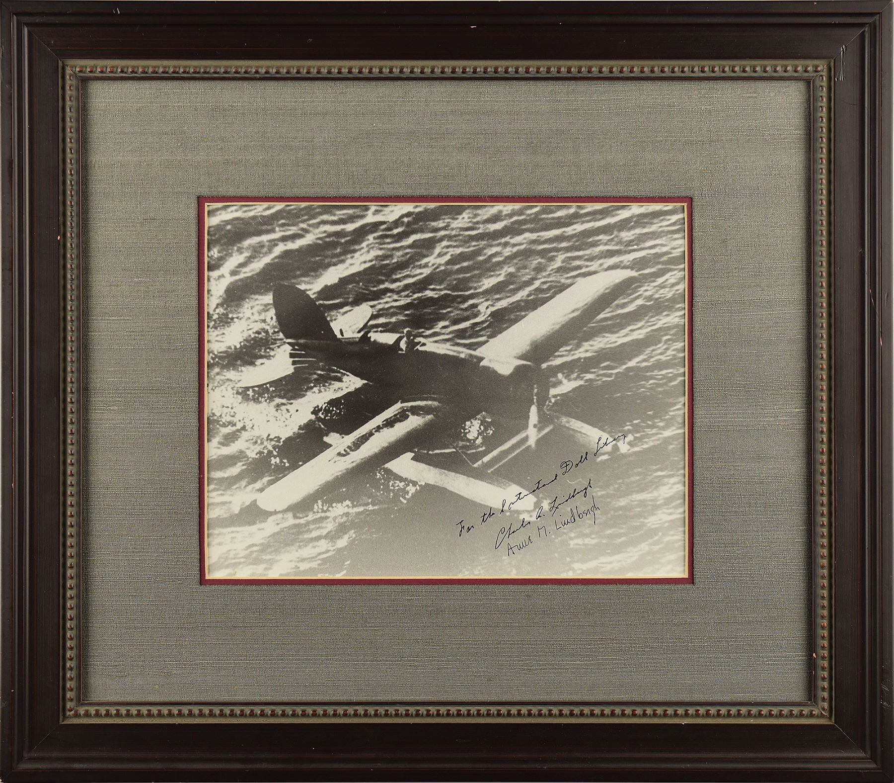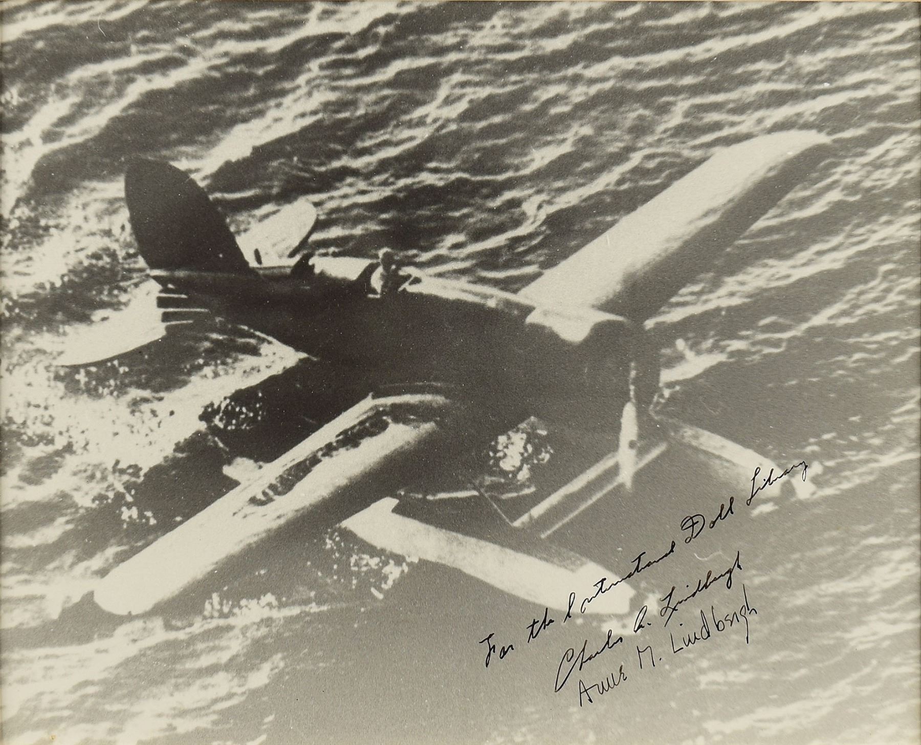 Fantastic vintage glossy 11.5 x 9 photo of the Lockheed 'Sirius' airplane which Lindbergh and his wife Anne flew together to the Orient in 1931, signed and inscribed in fountain pen, "For the International Doll Library, Charles A. Lindbergh" and "Anne M. Lindbergh.” Nicely double-matted and framed to an overall size of 21 x 18.5. In fine condition.