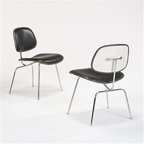 Charles and Ray Eames DCMs, pair Herman Miller USA, c. 1980 vinyl, plastic, chrome-plated steel 28.25 w x 19 d x 30.25 h inches Signed with molded manufacturer's mark to underside.