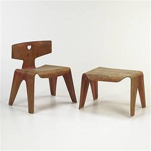 Charles and Ray Eames<BR>child's chair and stool<BR>Herman Miller<BR>USA, 1945<BR>aniline-dyed birch plywood<BR>13.5"w x 11"d x 14.5"h<BR>Baldwin Kingrey was one of only two stores that sold the Eames' children's furniture.<BR>Provenance: Estate of Kitty Baldwin Weese, Chicago<BR><BR><BR><BR>