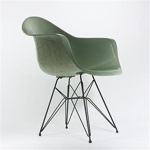 This chair represents the first fully formed fiberglass chair by Charles Eames. A smooth seating surface and rough, hand-laid fibers on the underside are indicative of the earliest production process. Welded ball feet on the handmade Eiffel Tower base predate the rubber glides utilized in typical production models.<BR><BR>Condition of the item is not included in this description. Condition reports are available from Wright upon request. Wright strongly recommends that you review a condition report for each item on which you plan to bid.