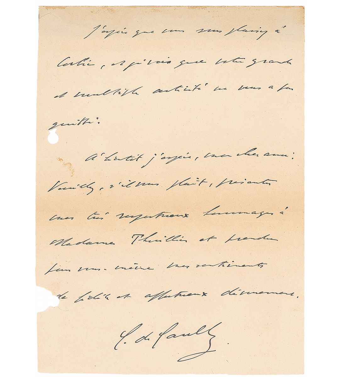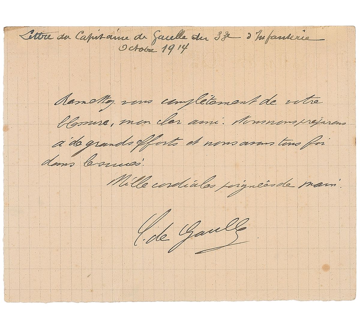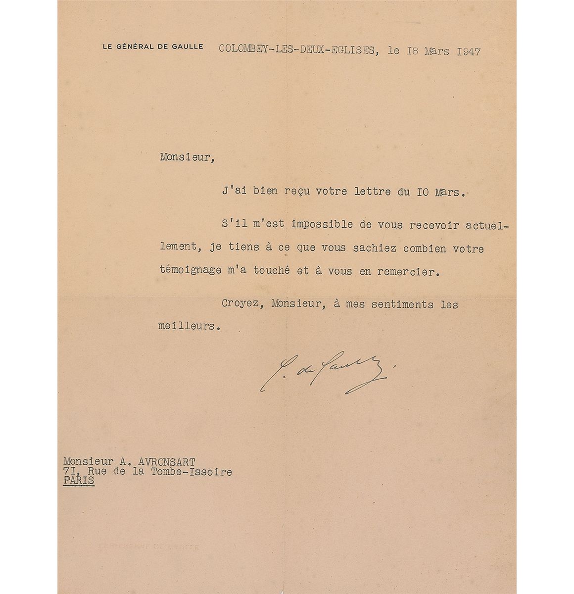 Three letters in French: an ANS signed “C. de Gaulle,” one page, 5.25 x 4, October 1914, in part (translated): “Recover from your wound, my dear friend, we have prepared very hard and we all have faith in success”; a partial ALS signed “C. de Gaulle,” one page, 5 x 7, March 4, 1934, affixed within a book in poor condition, in part (translated): “I hope you're enjoying a Corbie, and I see that your large and multiple activity does not leave you”; and a TLS signed “ C. de Gaulle,” one page, 8.25 x 10.5, personal letterhead March 18, 1947, in part (translated): “I have received your letter of March 10th…I want you to know how much your testimony touches me and thank you.” In overall fine condition. Accompanied by another softcover book in poor condition.