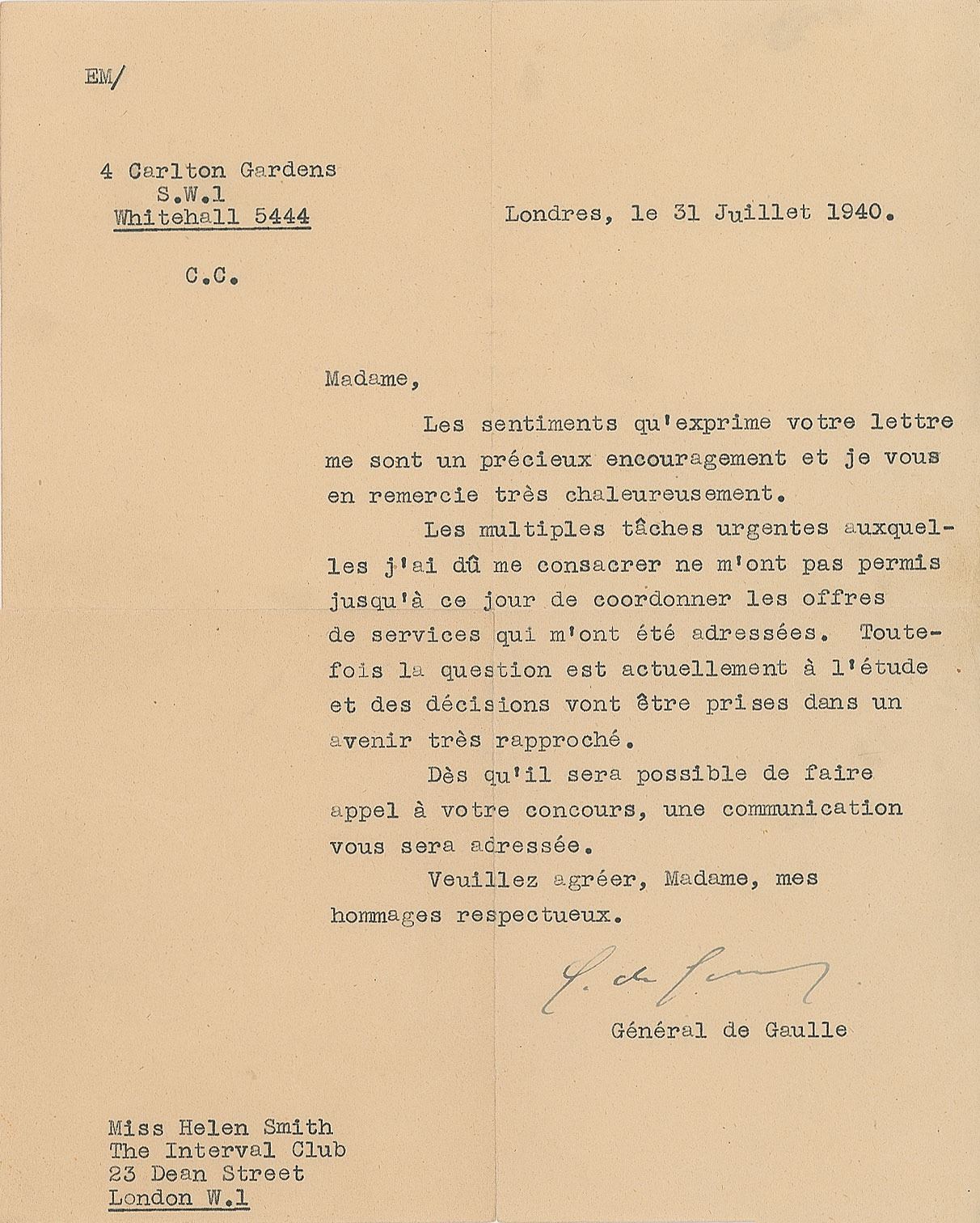 TLS in French, signed “C. de Gaulle,” one page, 7 x 8.75, July 31, 1940. Letter to Helen Smith of the Interval Club, a London-based theatre group. In part (translated): "The sentiments in your letter are a particular encouragement to me and I thank you for them very sincerely. The many urgent tasks to which I have had to devote myself have prevented me from coordinating the offers of help which have been made to me. The question is constantly under review and decisions are about to be made in the very near future. As soon as it is possible to call upon your cooperation, a communication will be addressed to you." In very good to fine condition, with splitting to the entire lower half of the vertical fold.