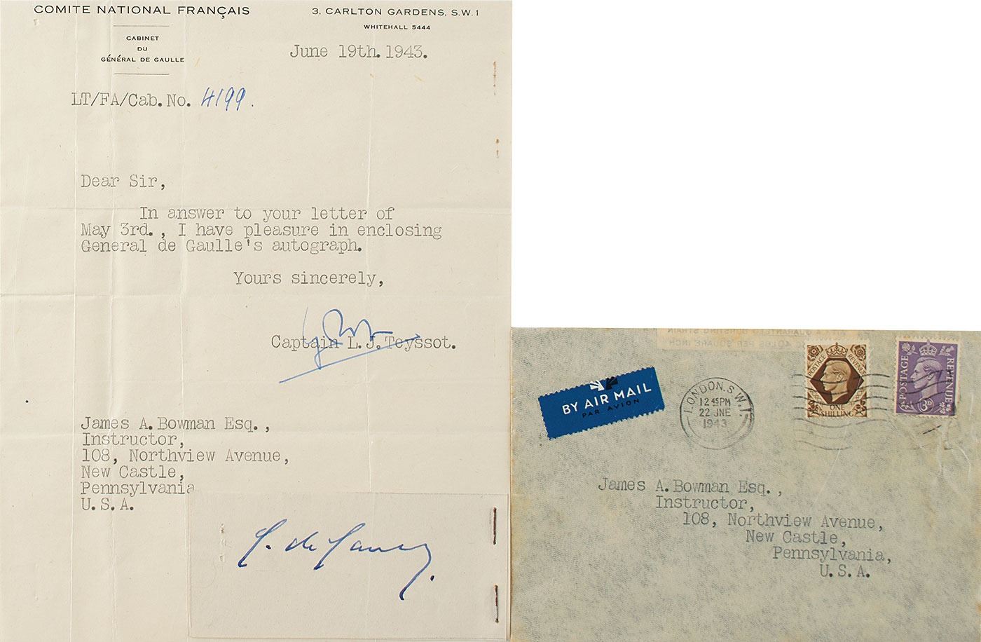 Vintage fountain pen signature, "C. de Gaulle,” on an off-white 3.75 x 1.75 slip, stapled to a transmittal letter dated June 19, 1943. In very good to fine condition, with staple holes to the left of the signature, and two staples to the right. Accompanied by the original mailing envelope.
