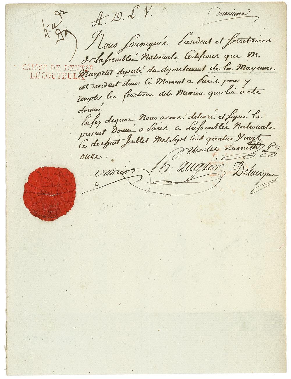 French politician and soldier who served in the American Revolution under Rochambeau and took part in the Battle of Yorktown. LS in French, one page, 8 x 12.5, no date. Untranslated document signed at the conclusion by de Lameth, and countersigned by three others. Some scattered light toning and foxing, light mirroring of red seal over small portion of signature, and a small pencil notation, otherwise fine condition. RRAuction COA.