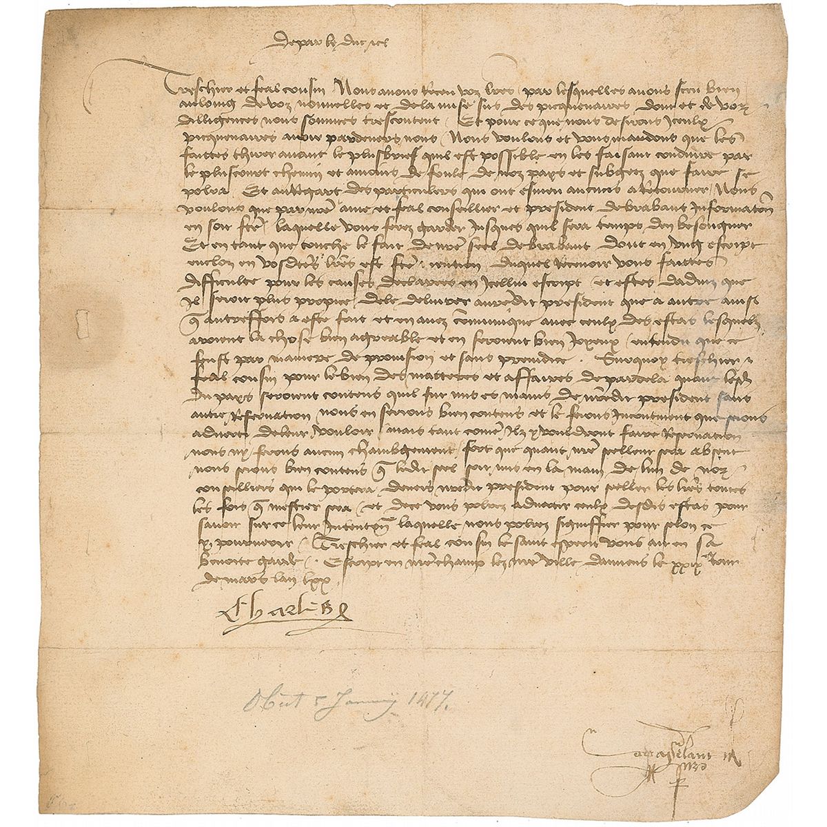 Duke of Burgundy from 1467–1477, referred to as Charles the Terrible by his enemies LS in French, signed “Charles,” one page, 8.5 x 9.25, March 29, 1470. A military order to Count John IV of Nassau-Dillenberg in which Charles declares himself well pleased with news he has received in a recent letter regarding the pikemen and orders that they should make their way to him. He also authorizes the use of the seal of Brabant. Intersecting folds, expected wear, and wax seal remnants to reverse, otherwise fine condition.