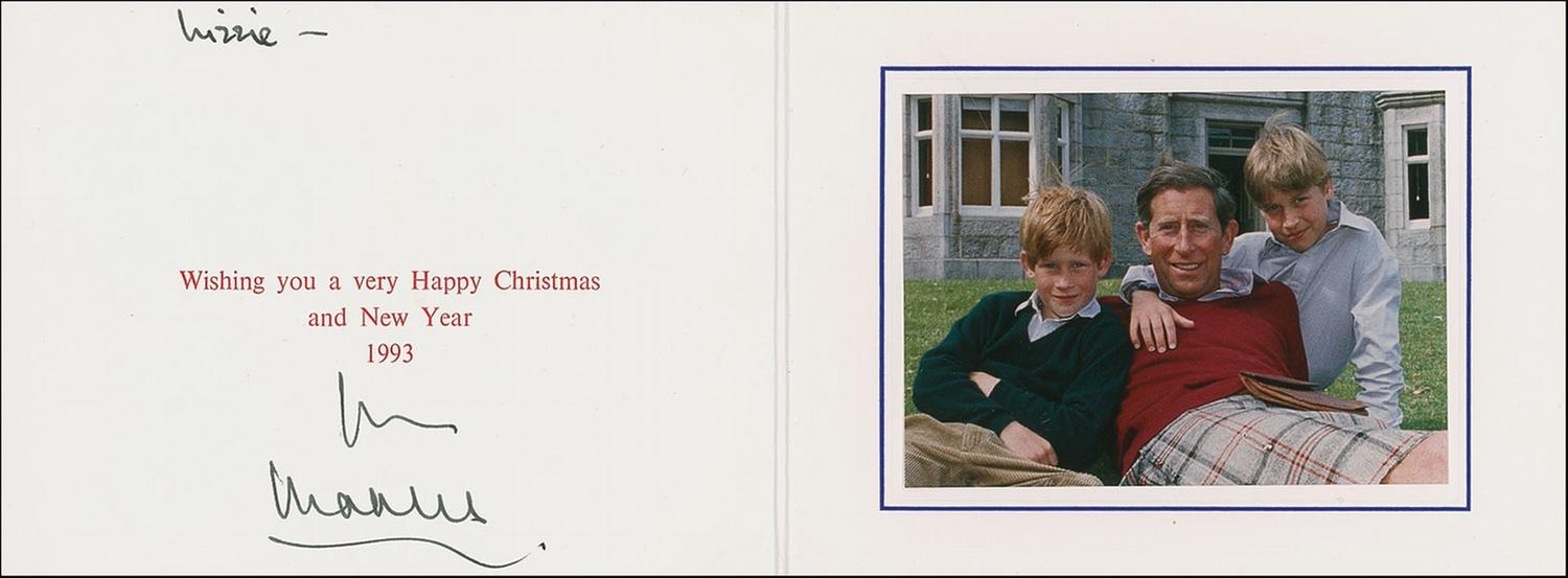 Christmas card from 1993, 8 x 6 folded, opens to 16 x 6, embossed in gold on the outside with Prince of Wales’s feathers and garter motto. Inside, the card bears a charming satin-finish 5.5 x 4 color casual family photograph of Charles, William, and Harry. Printed opposite the photograph is the sentiment “Wishing you a very Happy Christmas and New Year 1993,” inscribed at the top, “Lizzie” and signed at the bottom in black felt tip, “Charles.” In very fine condition. Accompanied by the original mailing envelope to Miss Elizabeth Norris, who worked for Charles and Diana at St. James Palace and later served as Charles’s personal secretary. Accompanied by a letter of provenance from Elizabeth Norris and her husband Colin Burgess.