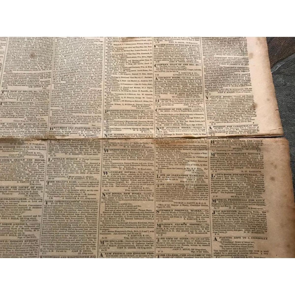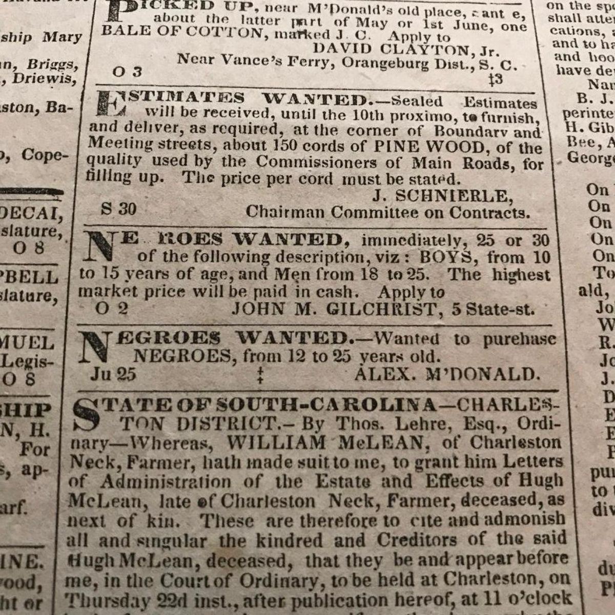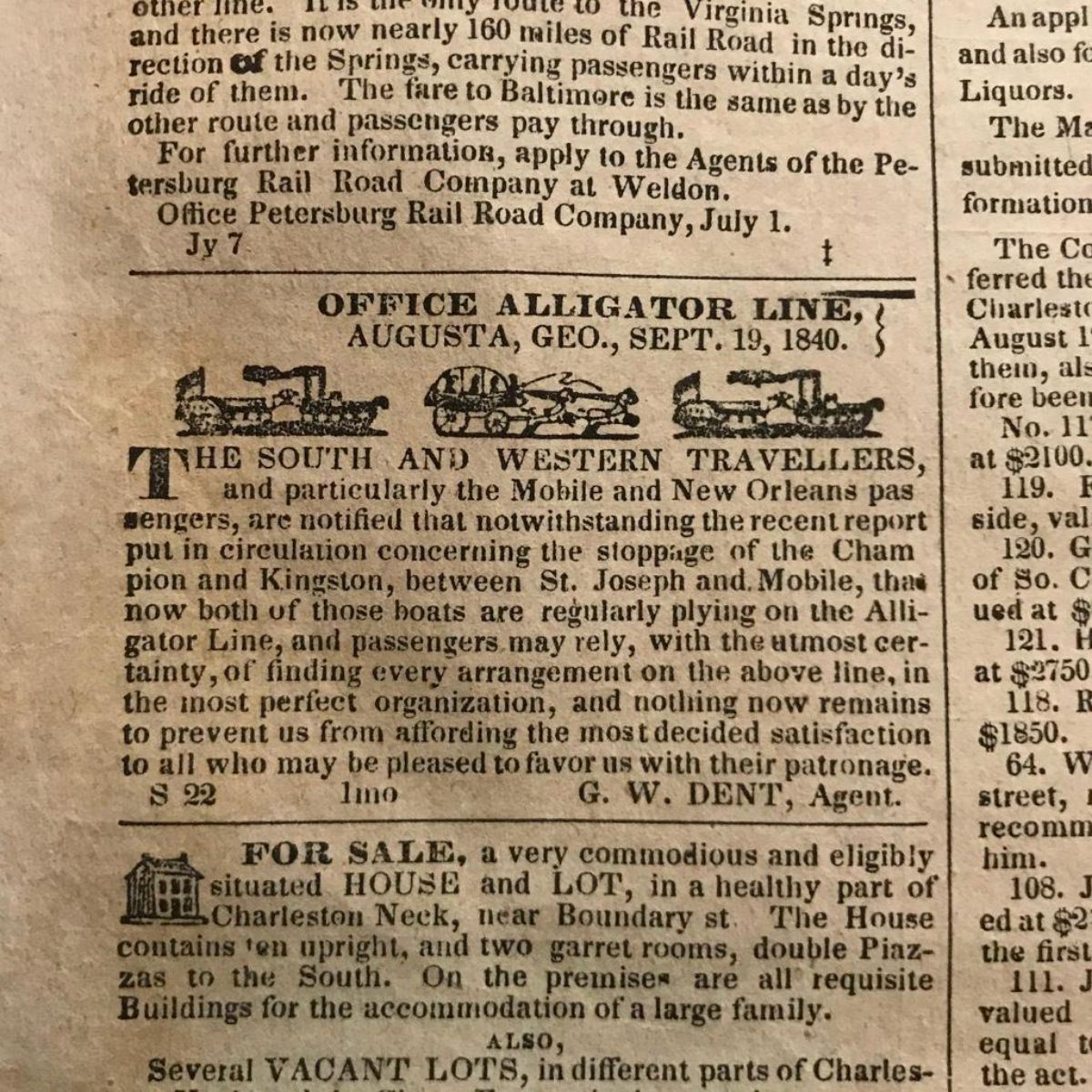 October 8, 1840 edition of The Charleston Courier newspaper. Interesting pre Civil War newspaper with news of the day, the Georgia elections, schedules for steamships & sailing vessels, legal notices & addresses for houses to let. Several sds for "Negroes Wanted To Purchase". * a large tear across the front at the fold. paper is very fragile.