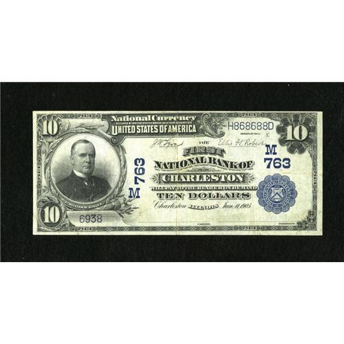 <B>Charleston, IL</B></I> - $10 1902 Plain Back Fr. 624 <B>The First NB</B></I> Ch. # (M)763<BR>The details are solid considering the amount of wear. There are only a few folds of significance though the note grades <B>Fine.</B></I><BR><I>From The Lincoln Collection</B></I><BR><BR><b>Shipping:</b> Coins & Currency (<a target="_blank" href="http://www.heritageauctions.com/common/shipping.php">view shipping information</a>)