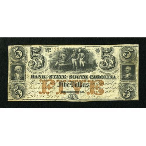 <B>Charleston, S.C. Bank of the State of South Carolina </B></I>$5 Jan. 10, 1858 G48c<BR> An attractive and problem-free example of this issue that features the Sweet Potato Dinner vignette seen on 1861 Confederate $10s. Fully signed and issued. <B>Fine-Very Fine.</B></I><BR><I>From The Collection of a Louisiana Gentleman</B></I><BR><BR><b>Shipping:</b> Coins & Currency (<a target="_blank" href="http://www.heritageauctions.com/common/shipping.php">view shipping information</a>)