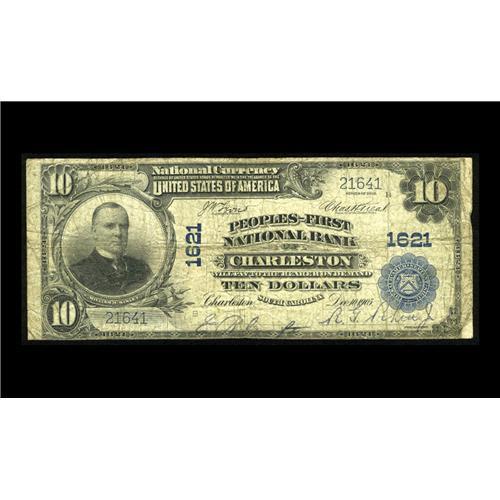 <B>Charleston, SC</B></I> - $10 1902 Plain Back Fr. 625 <B>Peoples-First NB </B></I> Ch. # 1621<BR>This Plain Back is the variety printed after September of 1925 with two bank serial numbers. The stamped signatures are still legible on this <B>Fine</B></I> example of the type bearing the second of two titles under which this institution issued large size.