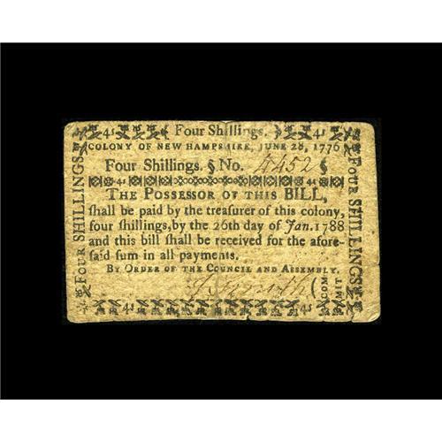 <B>New Hampshire June 28, 1776 4s Very Fine.</B></I> This is the first one of these rare notes we have had since joining forces with Heritage. The face is very sharp, while two minor splits are repaired on the back.<BR><BR><b>Shipping:</b> Coin/Currency (<a target="_blank" href="http://www.heritageauctions.com/common/shipping.php">view shipping information</a>)